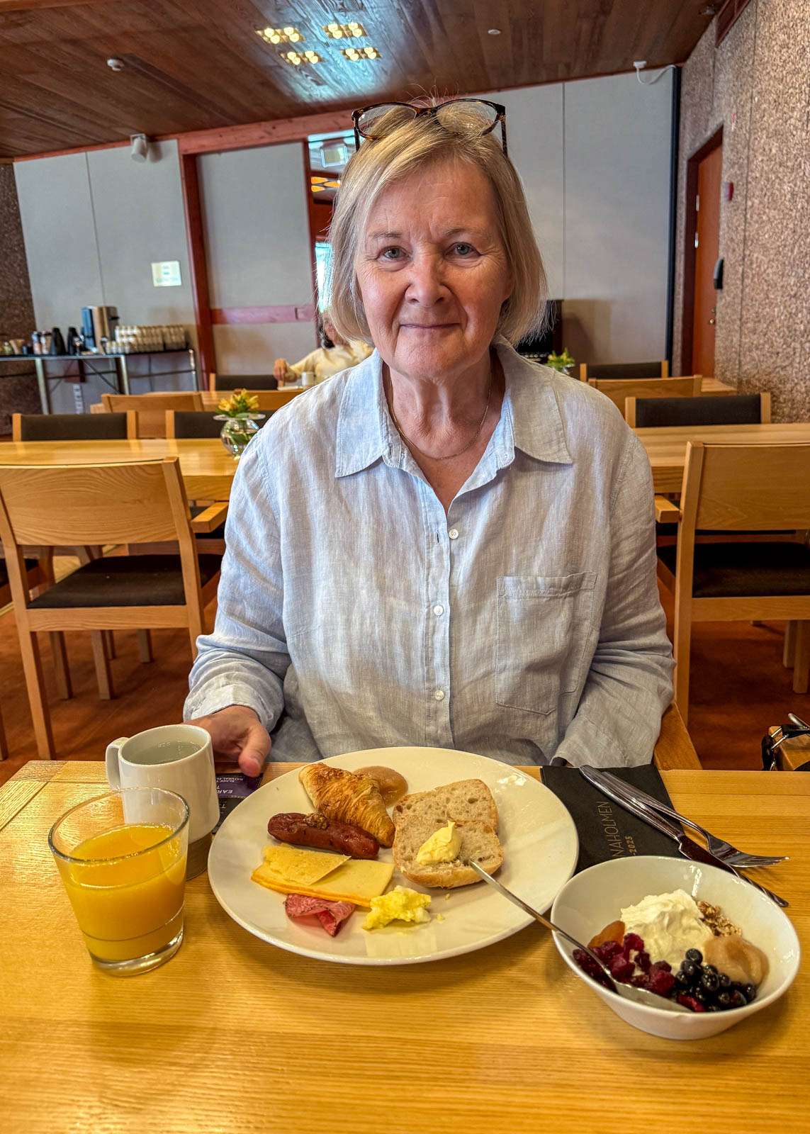 Aamu-uinnin jälkeen oli tietysti vuorossa hotelliaamiainen. Lauantai-aamuna väkeä riitti, mutta varsinaisia ruuhkia ei päässyt syntymään. Mitään aivan erityistä Hanaholmen-hotellin aamiaisella ei ollut – mutta en myöskään osannut kaivata mitään sellaista, mitä siellä ei olisi ollut tarjolla. No ehkä, sokerirotalle, makeita vaihtoehtoja olisi voinut vähän upgreidata :-)