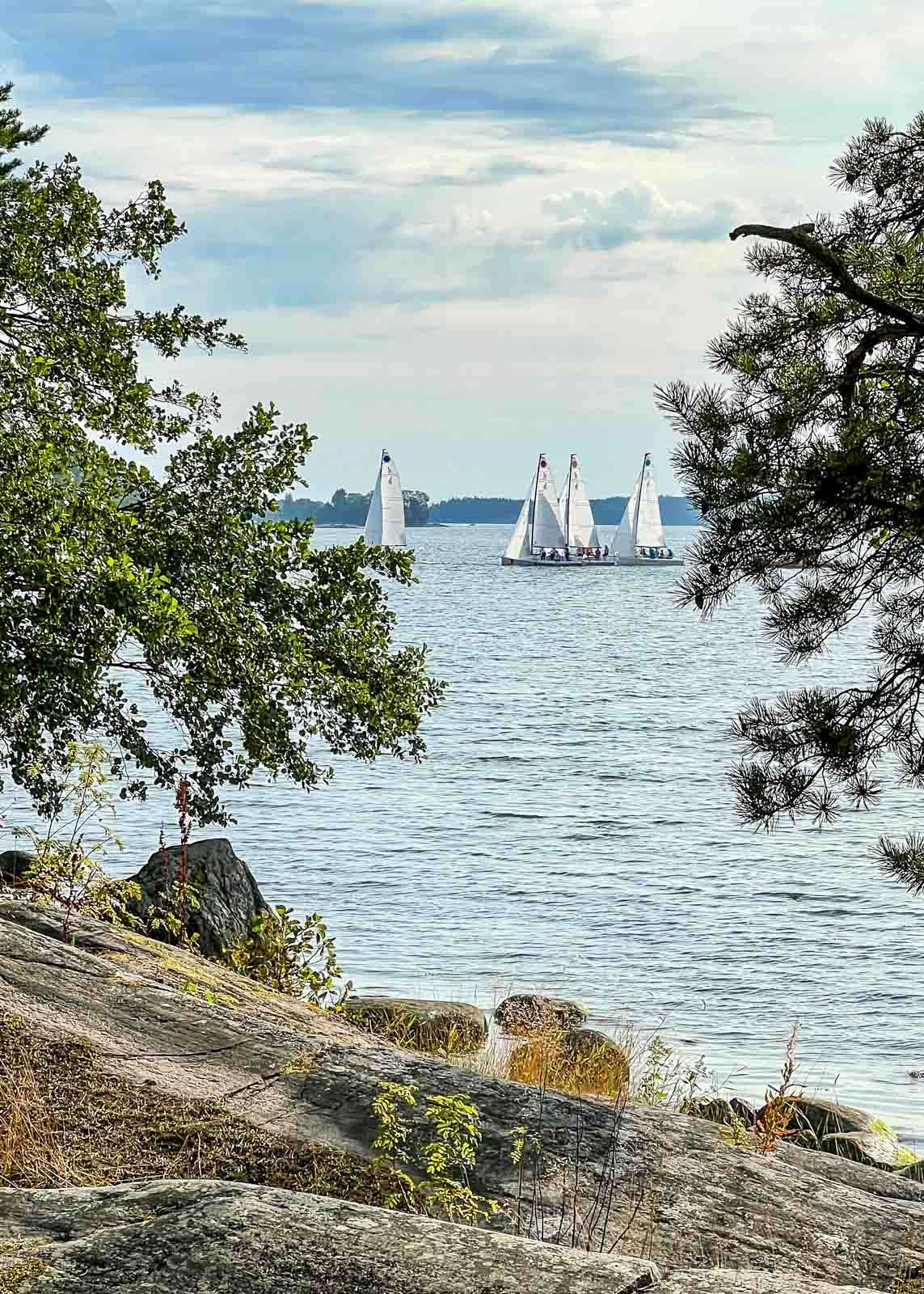 Juuri rantoja kierrellessämme ulapalla oli purjehduskilpailu alkamassa, joutsenet uiskentelivat saaren rannoilla ja tyrnin oranssit marjat olivat jo kypsymässä – merelliseksi mielletty kasvi kai sekin, tyrni. Saaren mustikat sen sijaan oli jo ehditty keräämään parempaan talteen – ehkä ihan hotellivieraiden syötäväksi, sillä kuulemma Hanaholmen-hotellissa tarjottavaa kalaa pyydystää kalastaja juuri näiltä vesiltä ja samainen kalastaja kerää marjojakin talteen hotellin keittiön käyttöön.