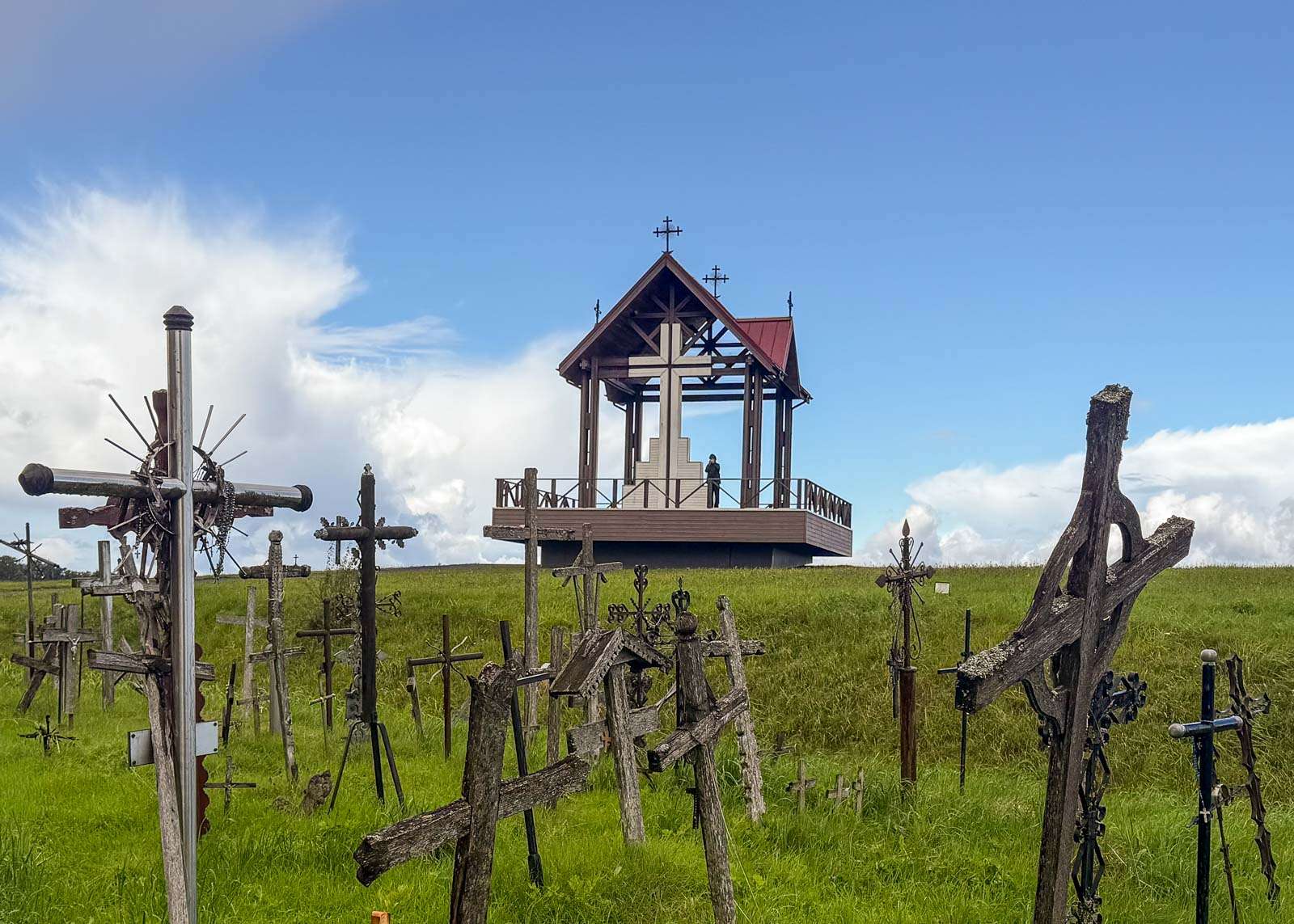 Meidän matkamme Ristikukkulalle alkoi aiheeseen sopivasti Riikan miehitysmuseon kupeesta. Parin tunnin automatkan (125 km) jälkeen käännyimme Ristikukkulalle vievälle sivutielle ja olimme perillä. Ennen kuin pieni kuuden hengen ryhmämme hajaantuu tuhansien ristien sekaan oppaamme kertoo paikan historiasta aloittaen kunnon turistioppaan tapaan legendalla.