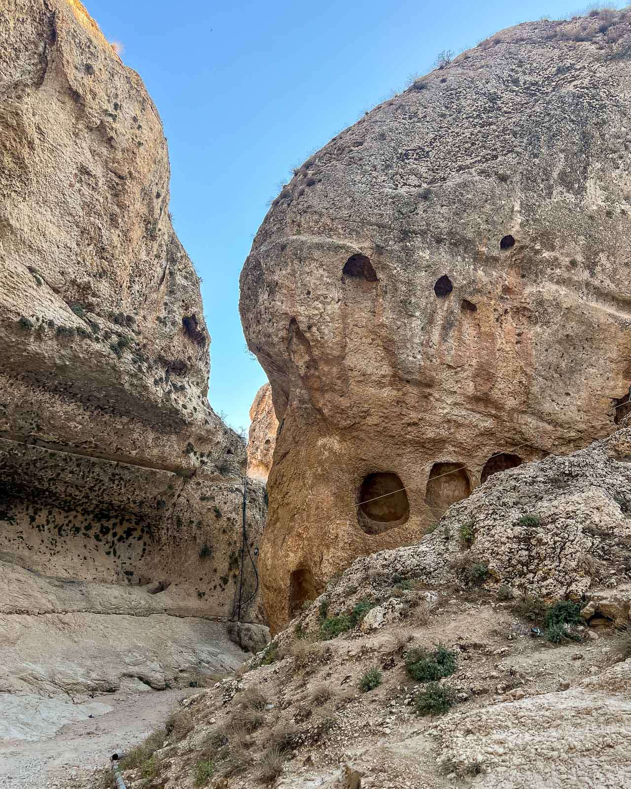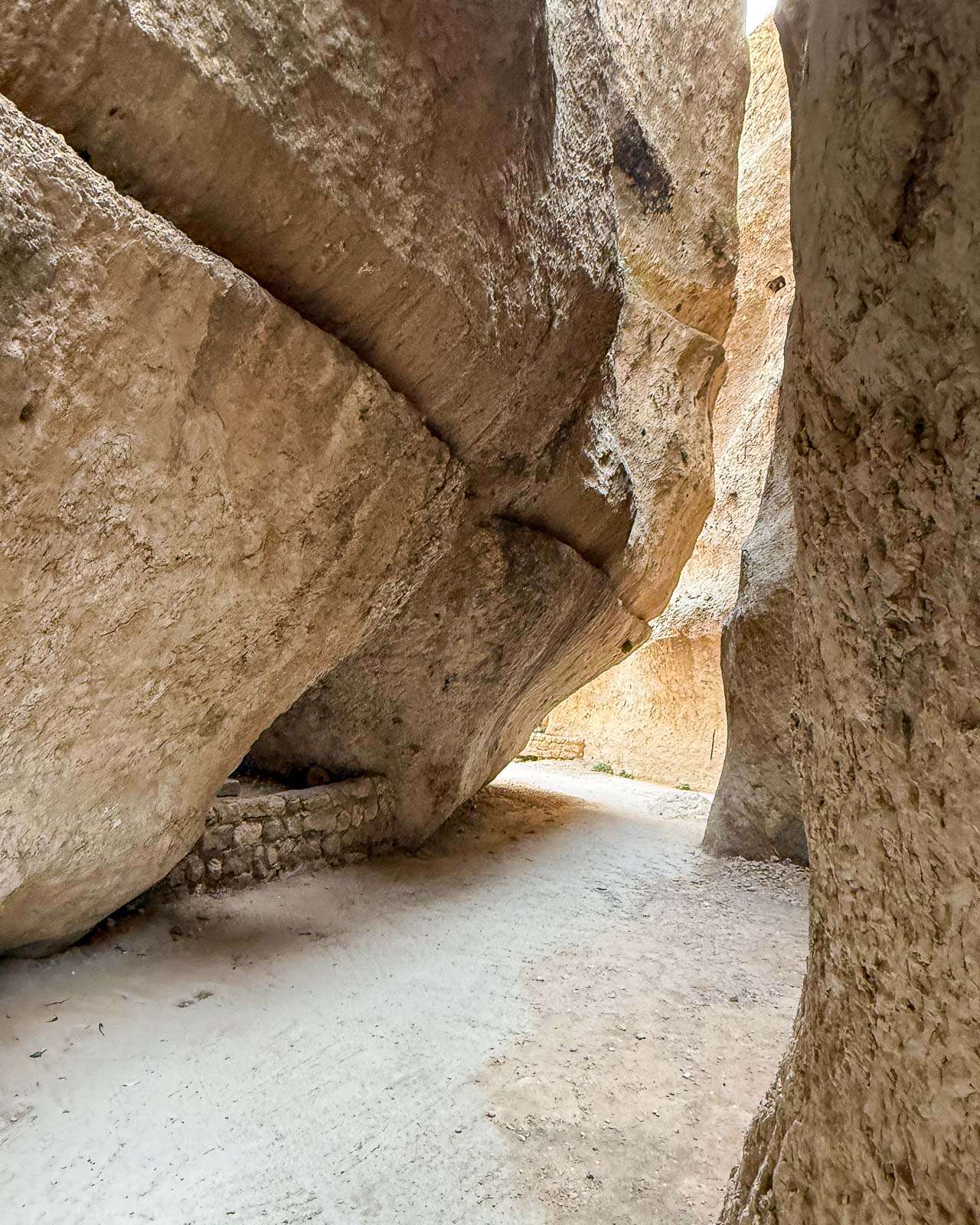 Polku osoittautui kulkevan kapeassa solassa. Solan seinämät kaartuivat kauniisti sen kummallakin puolella ja välillä polku oli todella kapea. Meille se toi mieleen Jordanian Petran, vaikka mittakaava olikin pienempi. Sola on ainoa reitti kylään pohjoisen suunnasta ja sen seinämät nousevat 20-30 metrin korkeuteen. Polun varrella näimme joitakin vanhoja kallioluolia, kuten muuallakin Maaloulaa ympäröivillä rinteillä. Sodan aikana solakin oli monta vuotta suljettuna, mutta nyt taas auki.