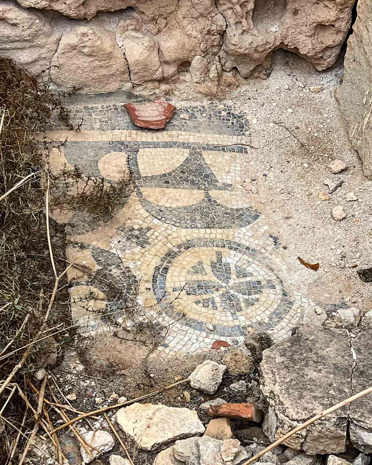 Rannan tuntumassa sijaitsevat myös kylpylöiden jäännökset – mosaiikkeja, pylväitä ja huoneita, joissa kuuma ja kylmä vesi aikoinaan virtasi. Etenkin Rooman valtakunnan aikoihin kylpylät olivat nekin merkittäviä tapaamispaikkoja, eli puhtaus ja sosiaalinen elämä kulkivat käsi kädessä. Emme kuitenkaan käyneet katsomassa niitä, sillä kylpylän reunalla olevat patsaat ja sen näyttävä mosaiikki oli, jos oikein ymmärsin, siirretty museoon Tripolissa, joten nähtävää ei ilmeisesti olisi ollut kovin paljoa.