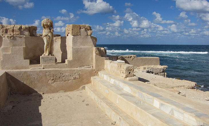 Foorumilta etenemme kohti rantaa, joka houkuttaa meitä melkein yhtä paljon kuin teatteri. Rannalla kohoaa Serapis-temppeli, jonka portaat ovat edelleen pystyssä. Temppeli oli omistettu egyptiläis-roomalaiselle jumalalle Serapikselle, joka yhdisti eri uskontoperinteitä. Temppelin vieressä on myös vanha oikeustalo, basilikaksi kutsuttu. Osa kaupungista on vajonnut mereen aluetta koetelleiden maanjäristysten myötä.