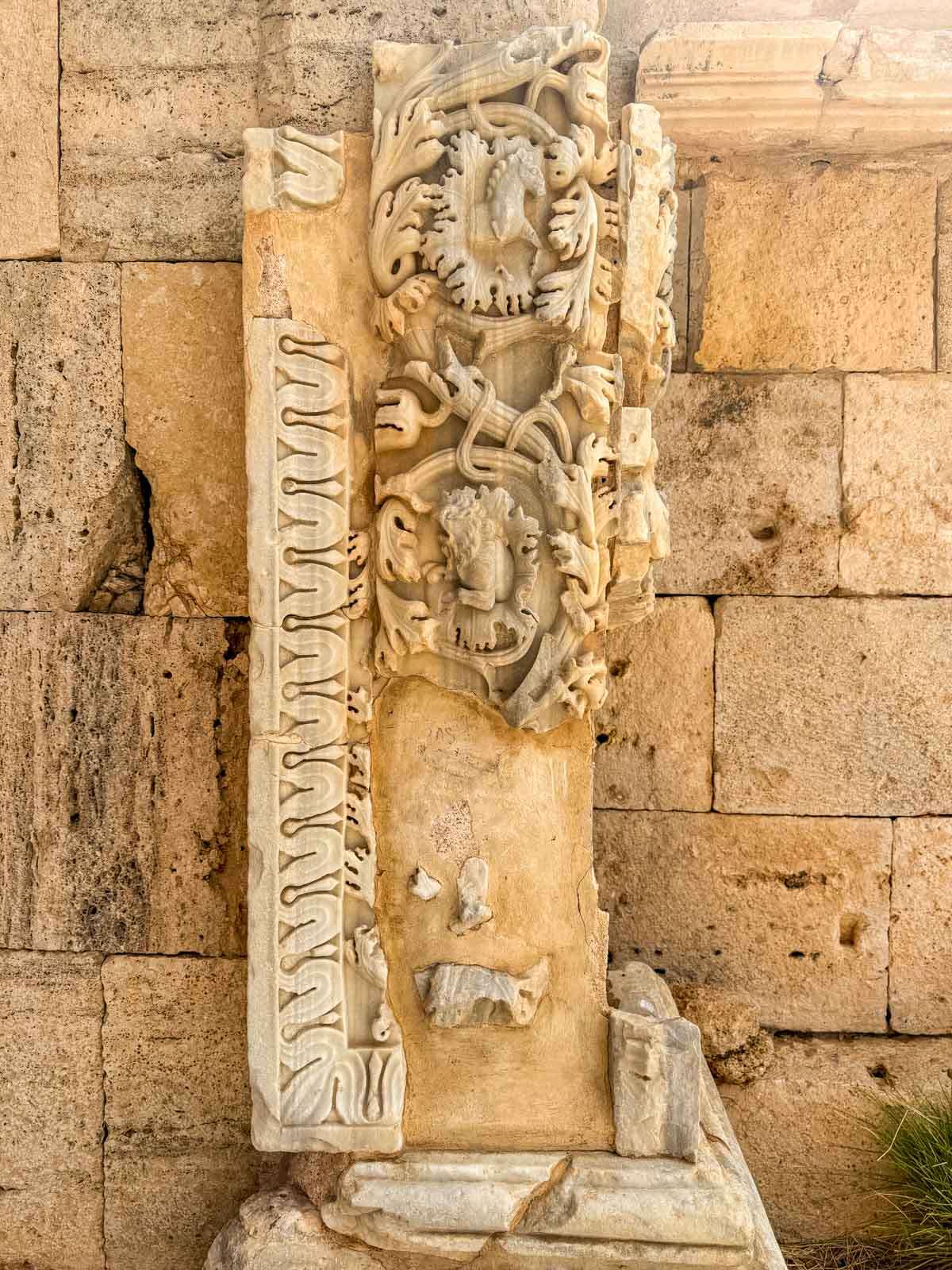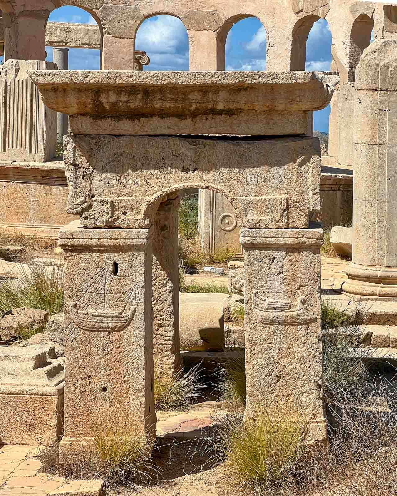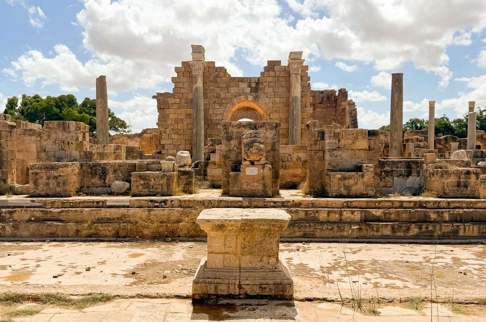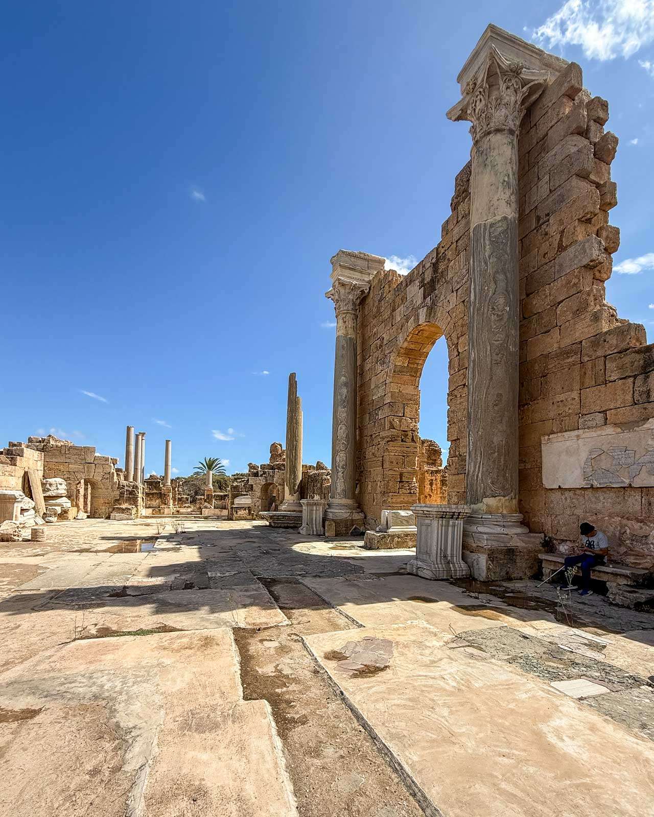 Kierros Leptis Magnassa alkaa tietysti, keisarin toiveen mukaisesti, hänen kunniakseen rakennettua riemukaarta ihailemalla. Nykyinen riemukaari ei enää ole vuodelta 203, vaan se on 1900-luvun kaivausten yhteydessä koottu ja rakennettu uudelleen – riemukaaren perustukset olivat paikallaan ja kaarikin löytyi kaivauksissa, mutta palasina.