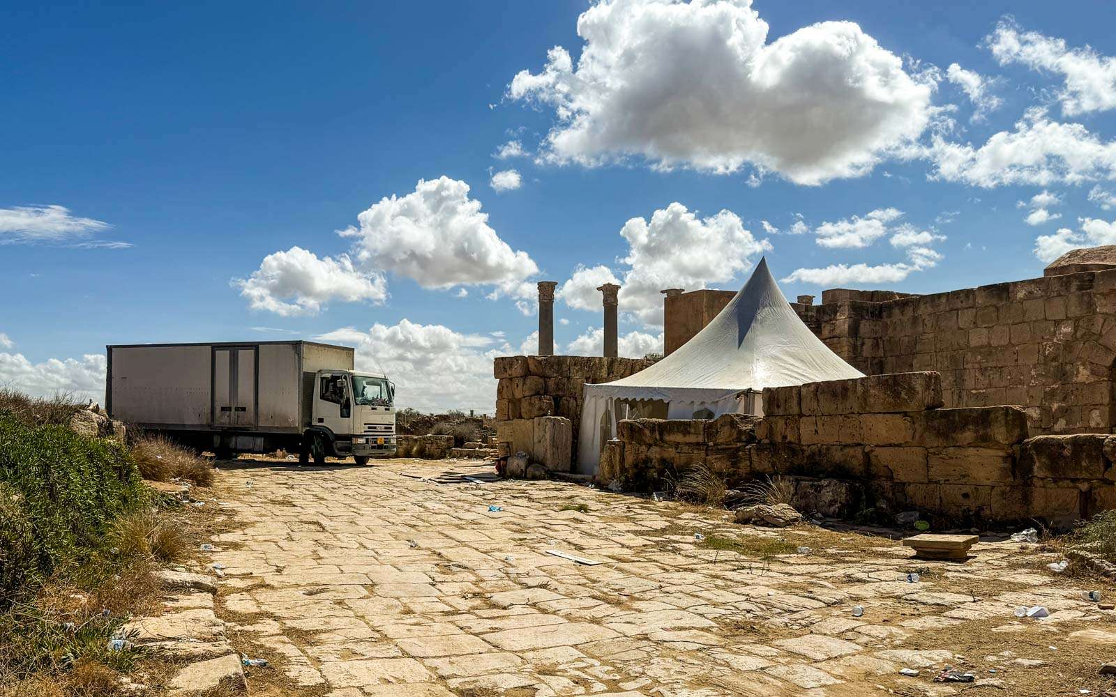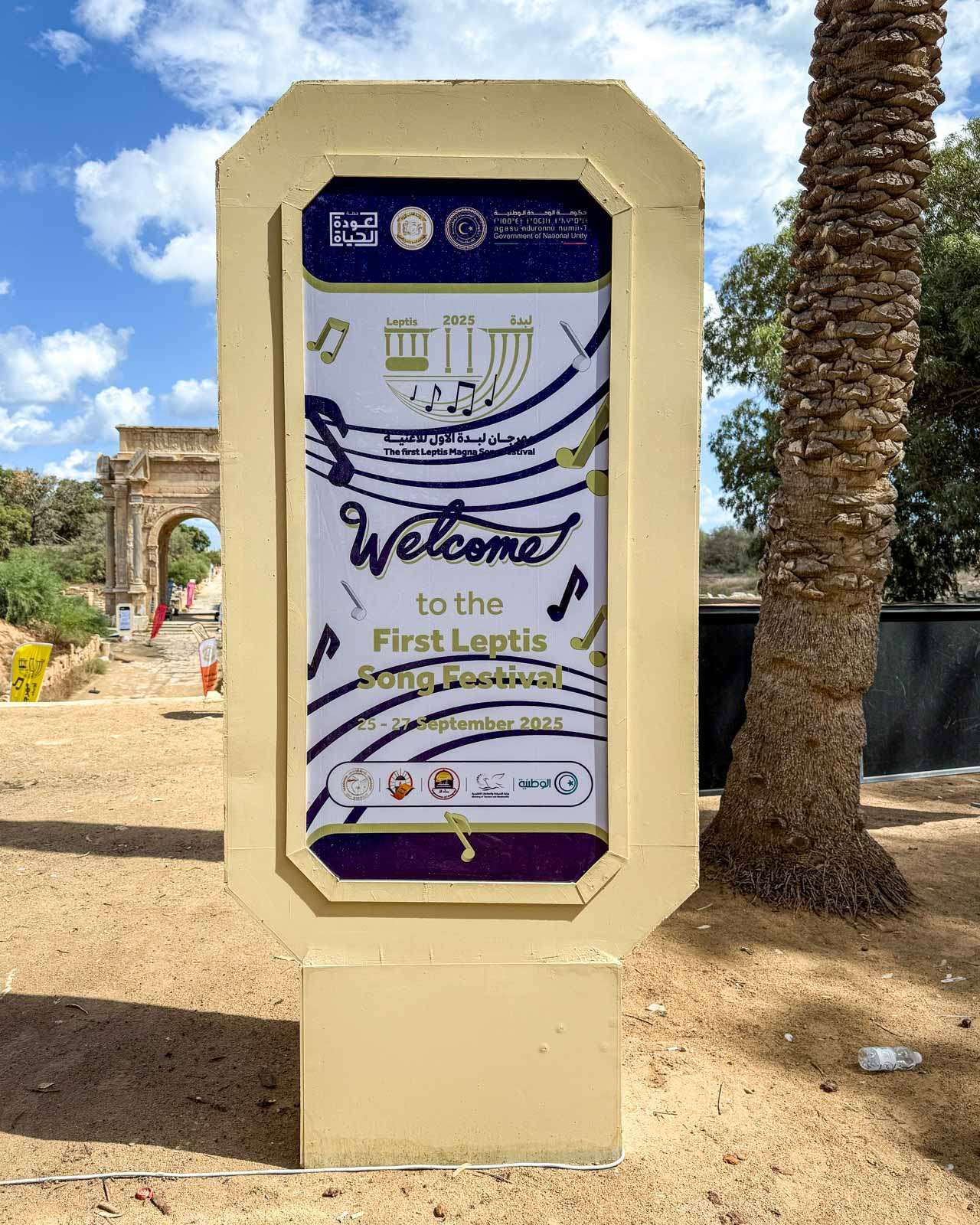 Saatamme kuitenkin olla ainakin ensimmäiset suomalaiset, jotka pääsivät todistamaan Leptis Magnaa nykyaikaisena festivaalipaikkana! Emme sattuneet paikalle ihan oikeana päivänä (ehkä emme turisteina olisi päässeetkään mukaan isompaan tapahtumaan), mutta pääsimme sunnuntaina todistamaan Leptis Magnan historiallisessa teatterissa järjestetyn ensimmäisen Leptis Magna Song Festivalin lavasteiden purkuoperaatiota. Tilaisuus oli rekvisiitasta päätellen omistettu edesmenneen libyalaisartisti Abdul Latif Hweilen muistolle. Syyriaan ja Libyaan suuntautuneella matkallamme näimme useampiakin näitä muinaisia teattereita ja jo Aleppon linnoituksella kävi mielessä, että järjestetäänköhän näissä nykyisinkin jotain tapahtumia ja nyt näimme, että ainakin Leptis Magnassa järjestetään!