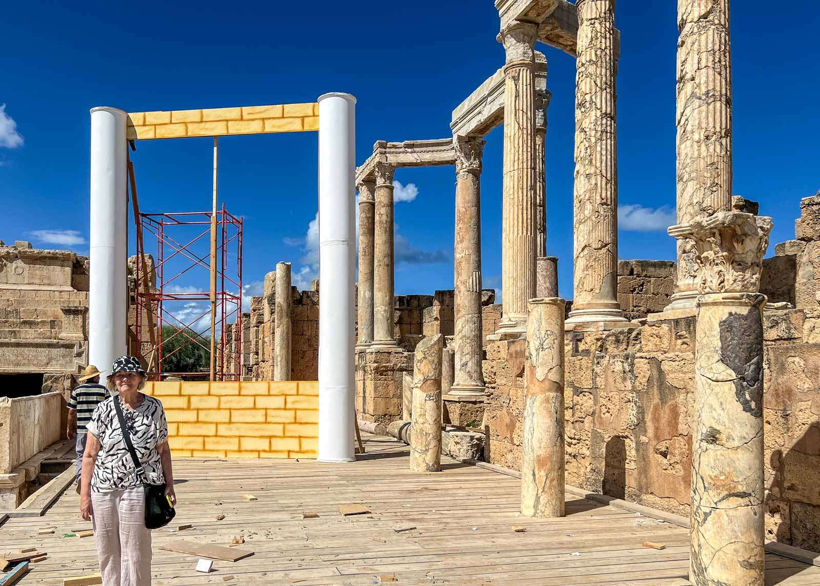 Lopulta vuorossa oli teatteri, jossa toisin kuin muuten Leptis Magnan kaupunkia kierrellessämme, tapasimme useita muitakin ihmisiä kuin meidän pieni seurueemme, me, kohdeopas ja paikallisopas – turistipoliisi piti sentään taukoa, piti varmaan muinaista kaupunkia ja kahden oppaan yhdistelmää meille riittävän turvallisena ilman häntäkin. Teatterissa oli nimittäin menossa jo mainittua festivaalia varten tehtyjen rakennelmien purkutyöt.