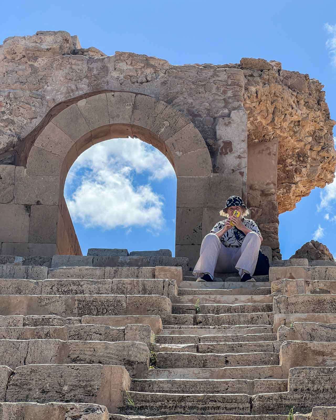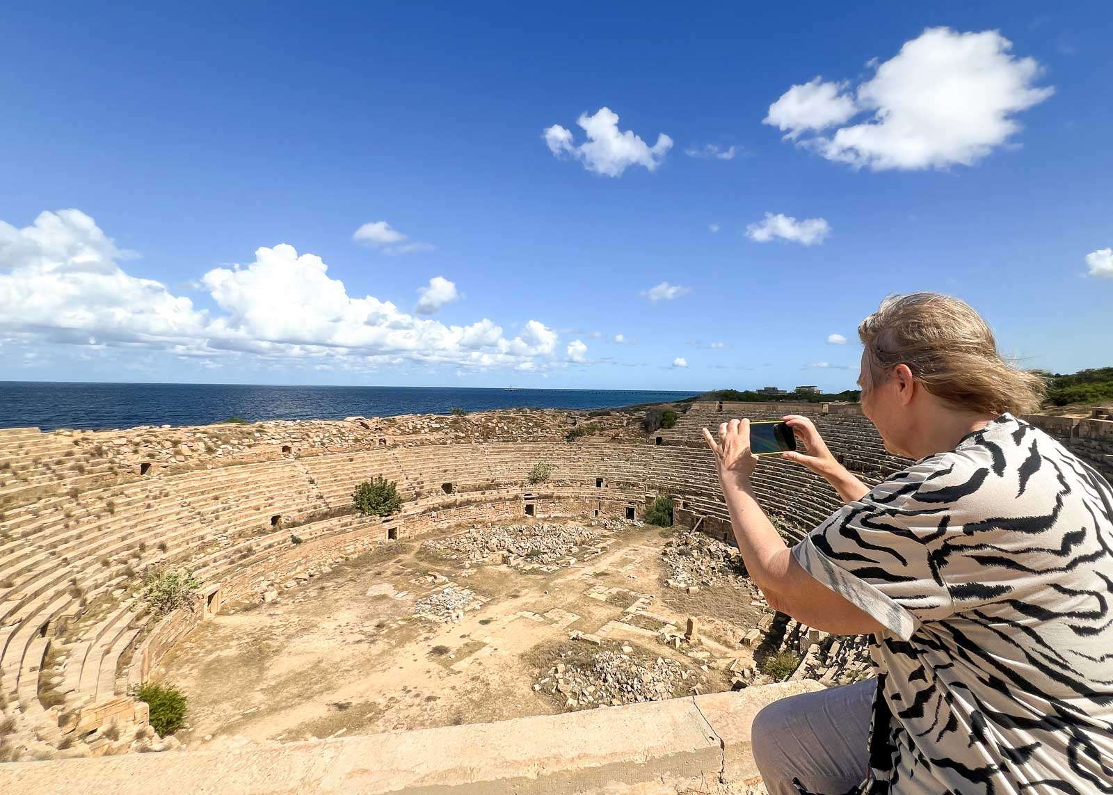 Mahduimme kuitenkin hyvin mekin teatterille, niin lavalle kuin kiipeämään ylös katsomoon – ja aistimaan sen suuruuden. Leptis Magnan katsomoon mahtunee noin 15 000 katsojaa, eli vaikka se suuri onkin, niin kuitenkin pienempi kuin Rooman Colosseum (50 000 katsojaa) ja Tunisian El Jem (35 000) katsojaa.