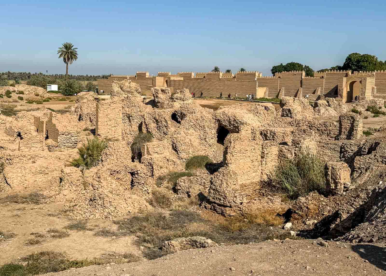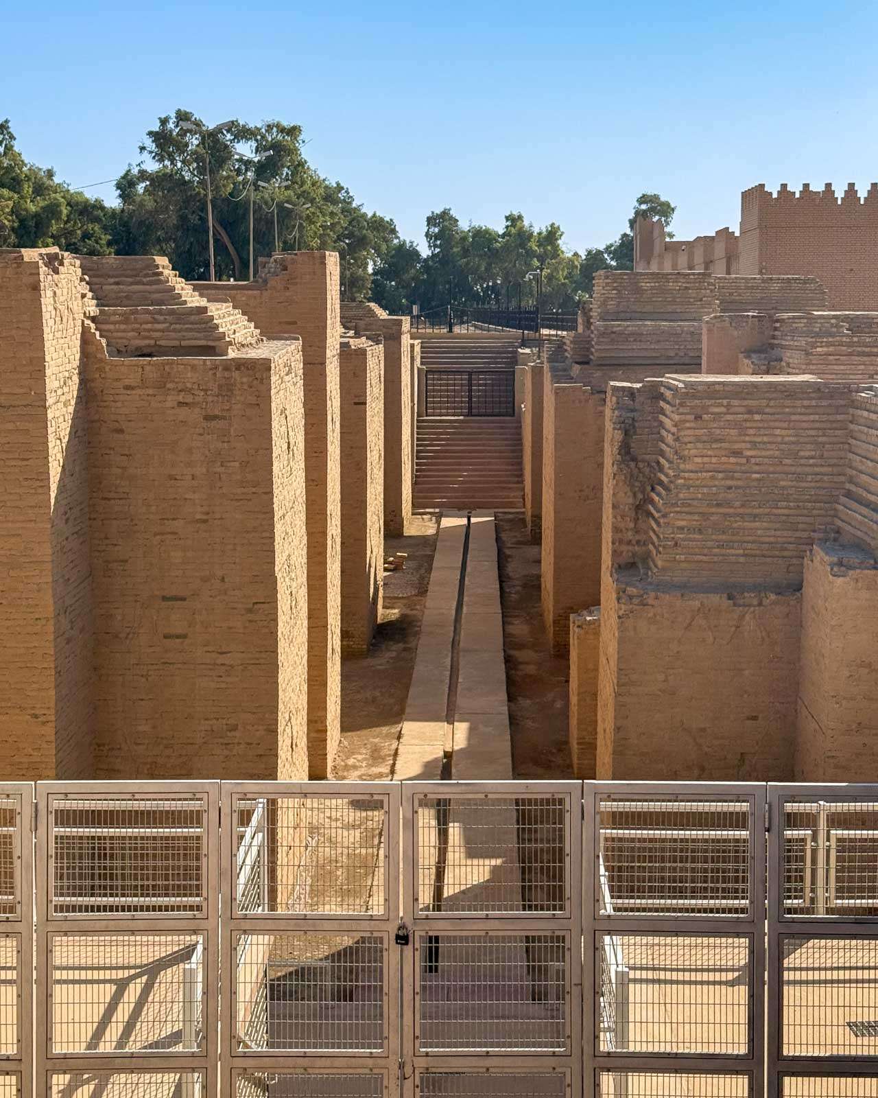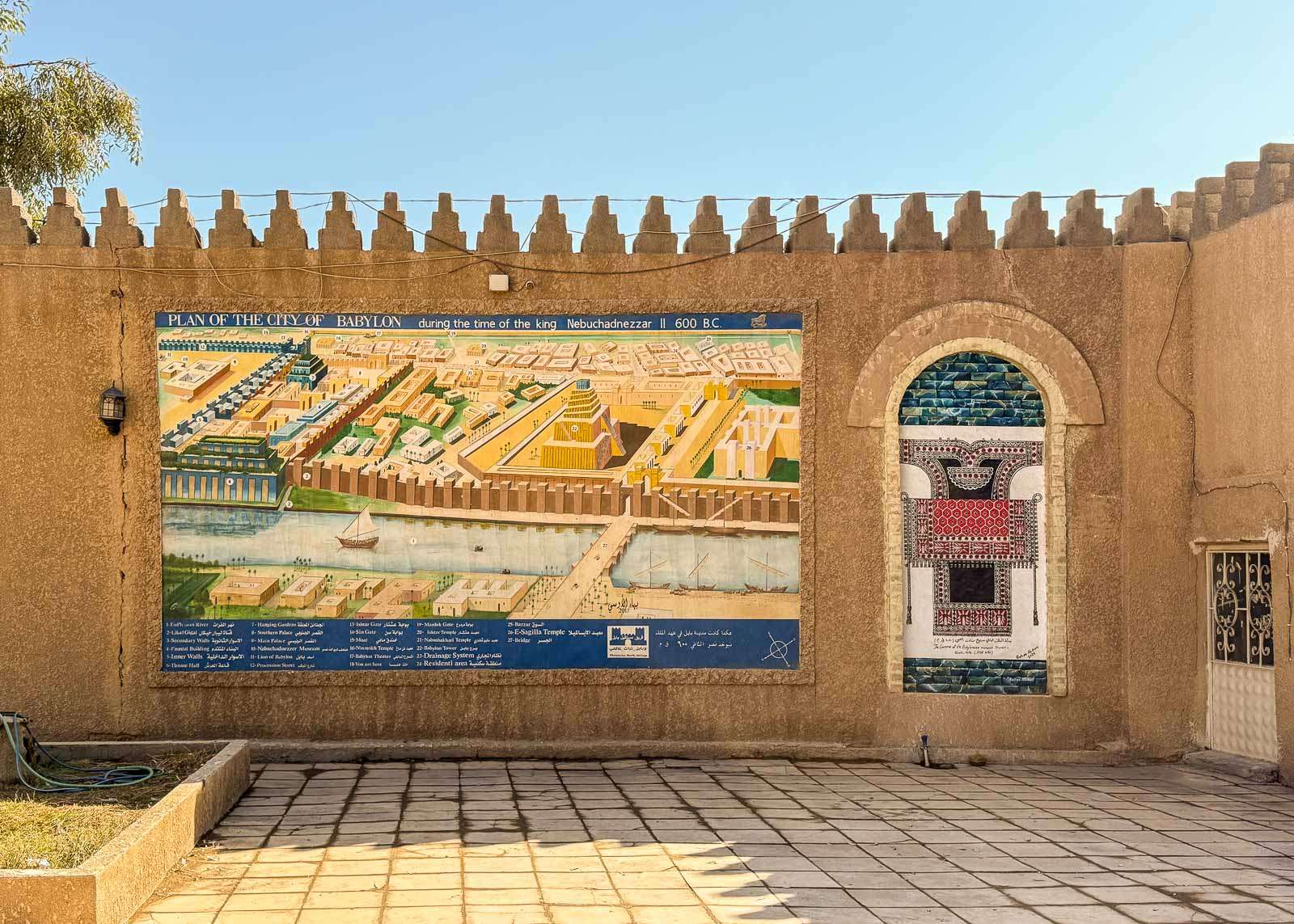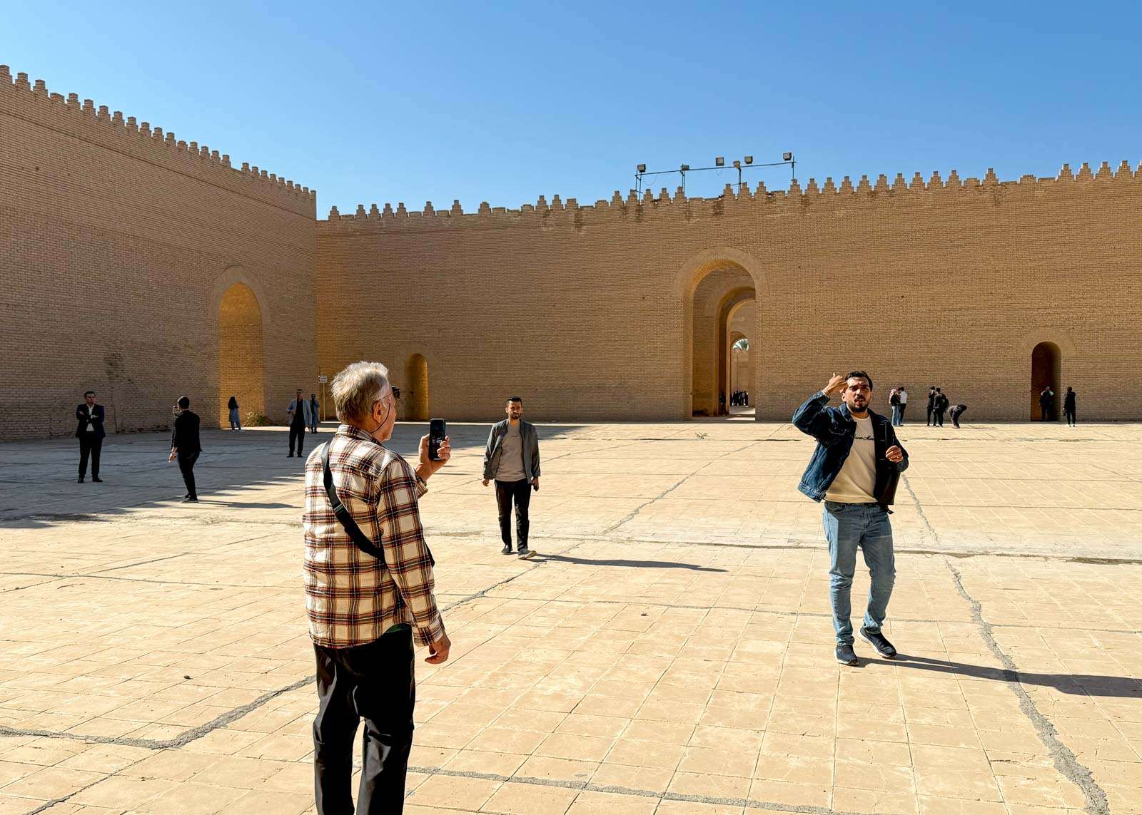 Museovierailun jälkeen vaeltelimme muinaisen Babylonin isoilla aukioilla, jotka uusittuine tiiliseinineen eivät näyttäneet yhtään antiikkisilta. Siellä täällä on nähtävissä tiiliä, joissa korostetaan Saddamin ansioita Babylonin “korjaamisessa”. Korjaustyöt on sinänsä tehty hyvin, pienten kellertävien tiilien koko ja väri vastaavat alkuperäistä. Ainakin paikoitellen entisöityjen muurien juurella on kuulemma vanhojakin tiiliä näkyvissä, Nebukadnessarin ajalta.