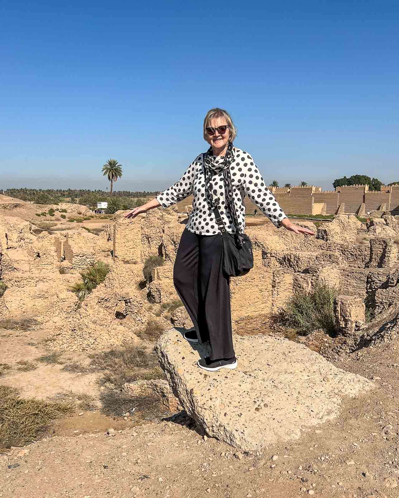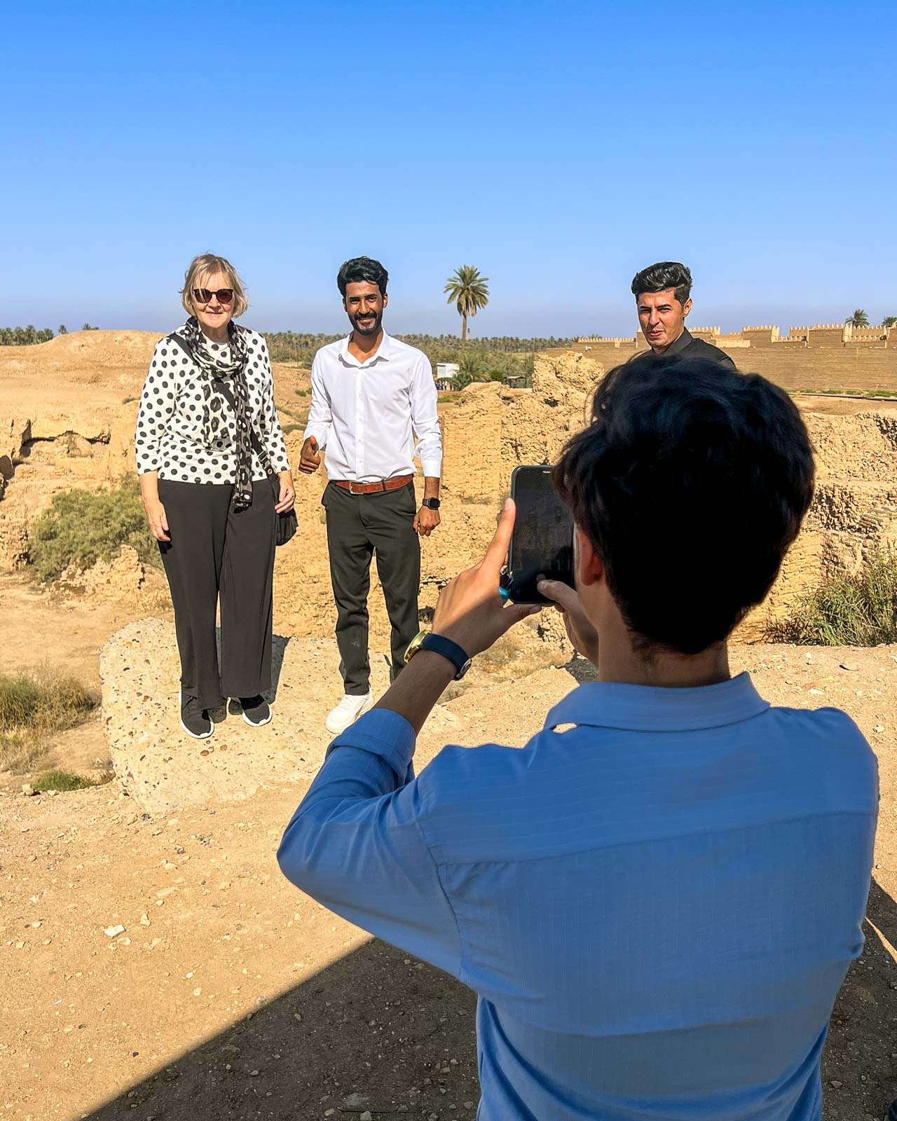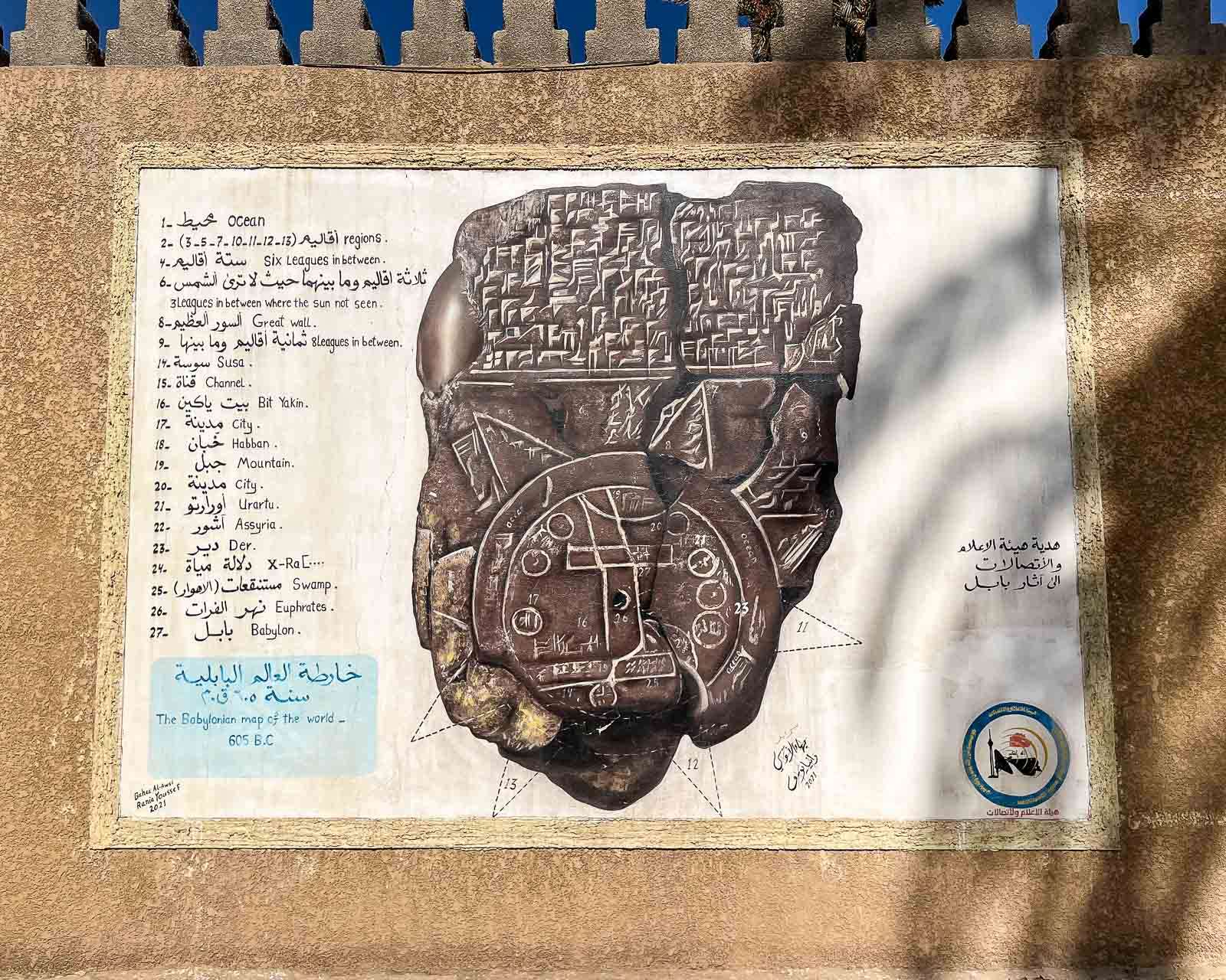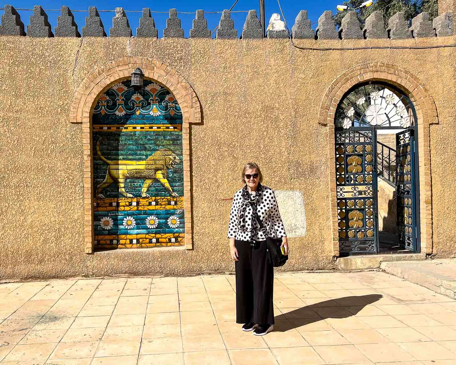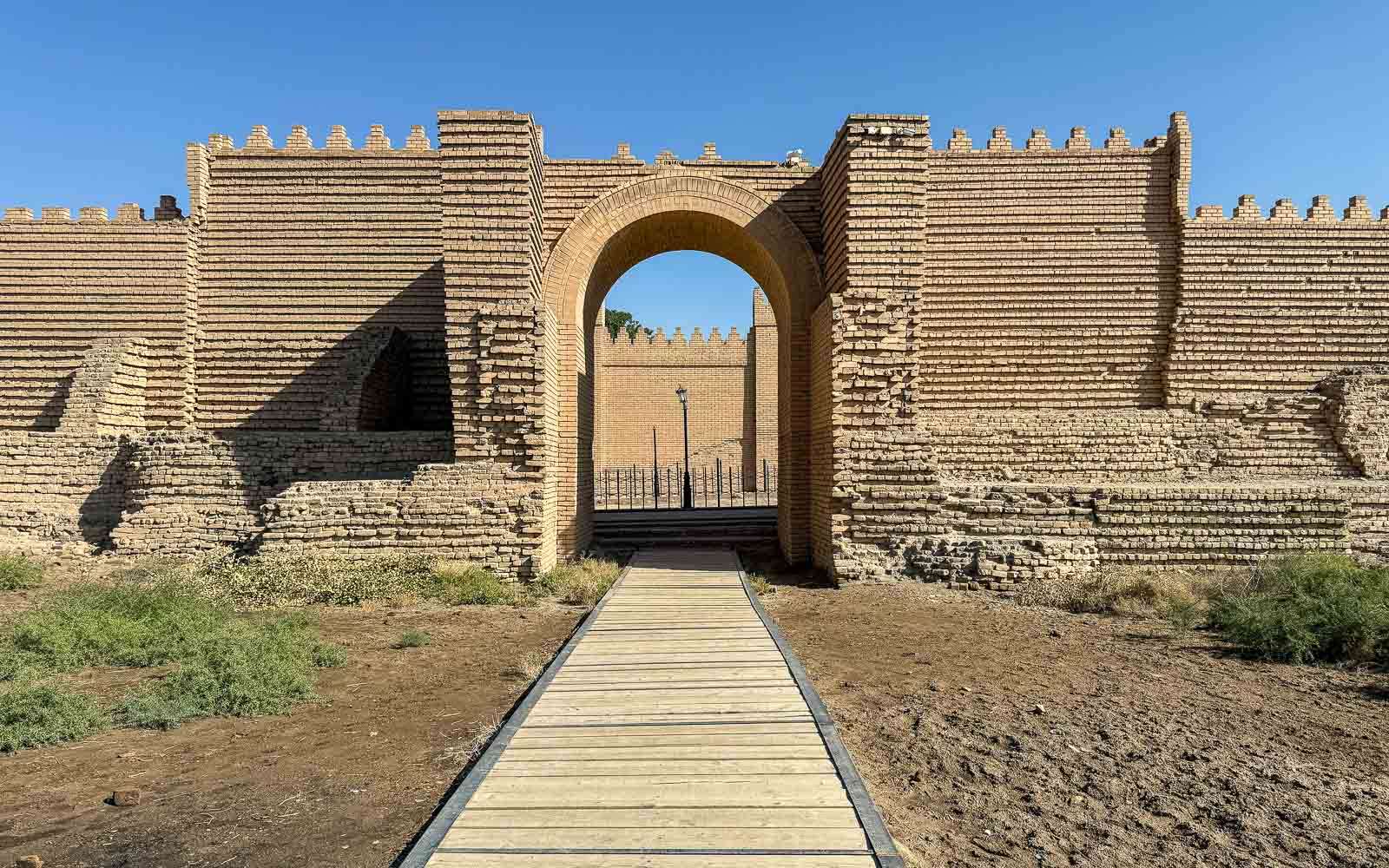 Museovierailun jälkeen vaeltelimme muinaisen Babylonin isoilla aukioilla, jotka uusittuine tiiliseinineen eivät näyttäneet yhtään antiikkisilta. Siellä täällä on nähtävissä tiiliä, joissa korostetaan Saddamin ansioita Babylonin “korjaamisessa”. Korjaustyöt on sinänsä tehty hyvin, pienten kellertävien tiilien koko ja väri vastaavat alkuperäistä. Ainakin paikoitellen entisöityjen muurien juurella on kuulemma vanhojakin tiiliä näkyvissä, Nebukadnessarin ajalta.