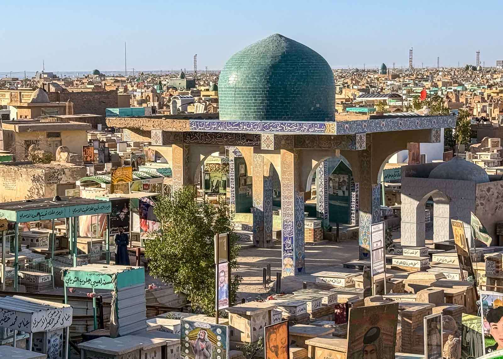 Hautausmaa on sekin tietysti pyhä paikka monille shiiamuslimeille, jotka haluavat tulla haudatuiksi Imam Alin läheisyyteen. Ainakin jokin kulma hautausmaakaupunkia on lähellä Najafin pyhäkköä, siis Imam Alin moskeijaa. Ennen hautaamista omaiset käyvät vielä arkkua kantaen pyhäkössä ja näimmekin useampia pieniä miesryhmiä, jotka kantoivat arkkua harteillaan. Tottelimme kuitenkin oppaamme ohjetta olla kuvaamatta hautajaisseurueita.