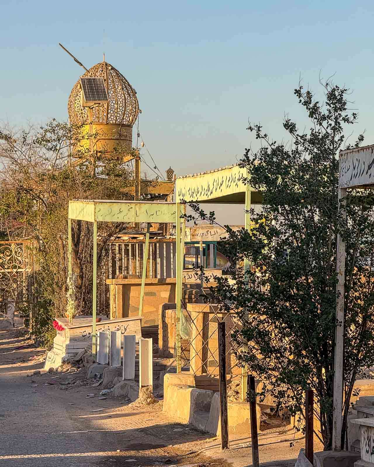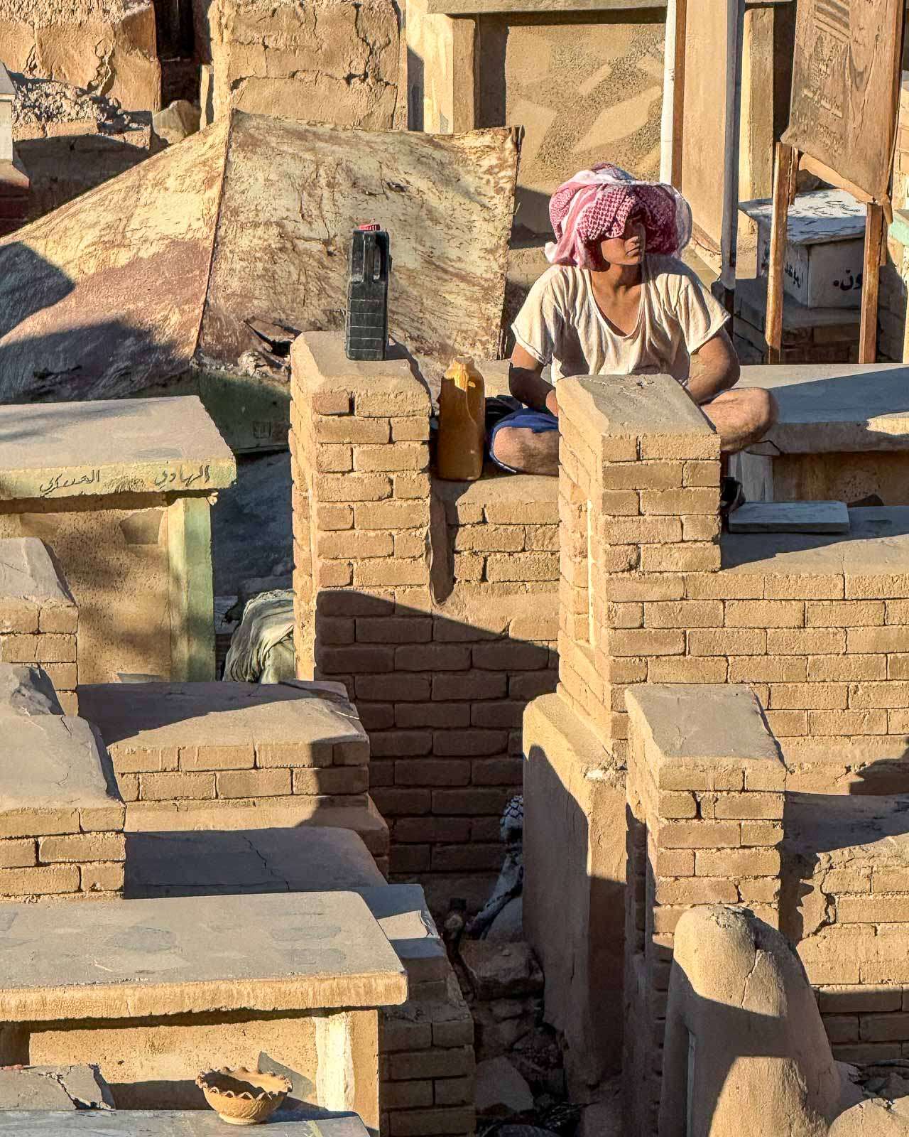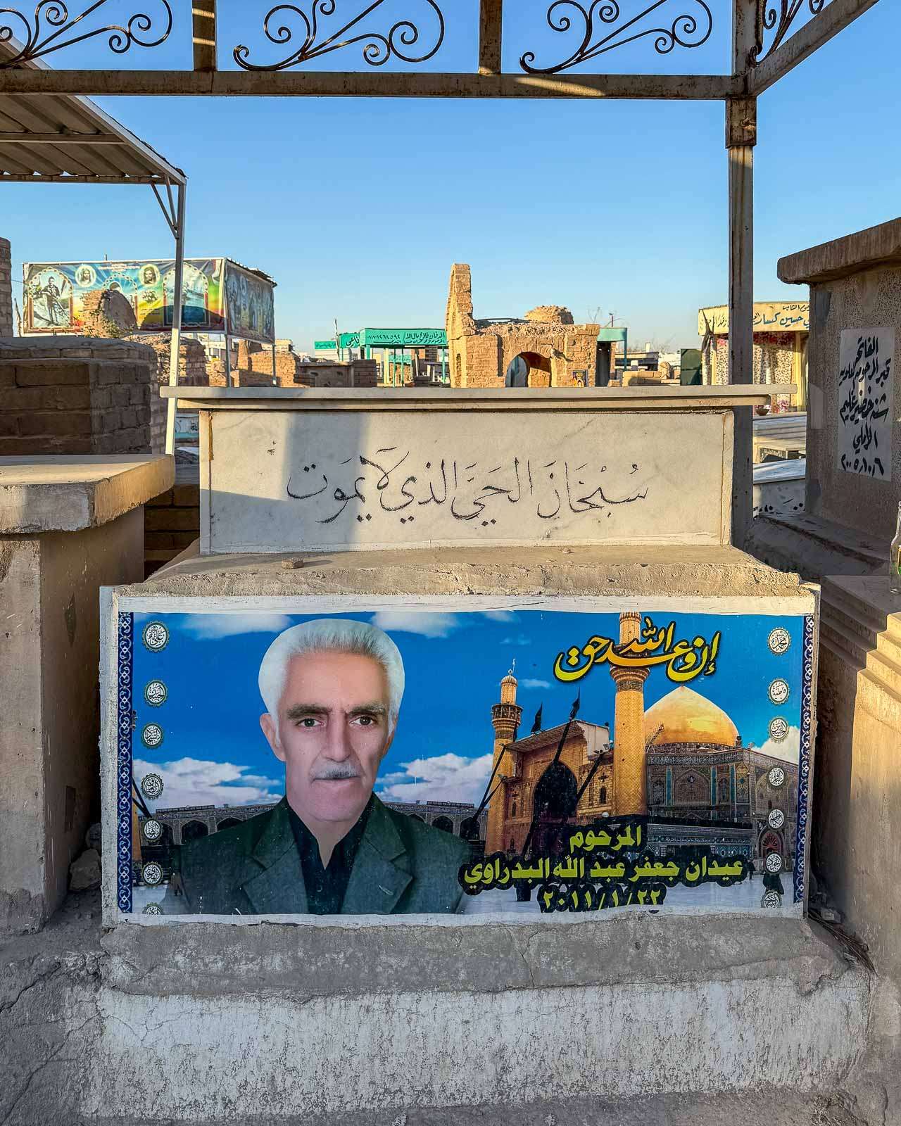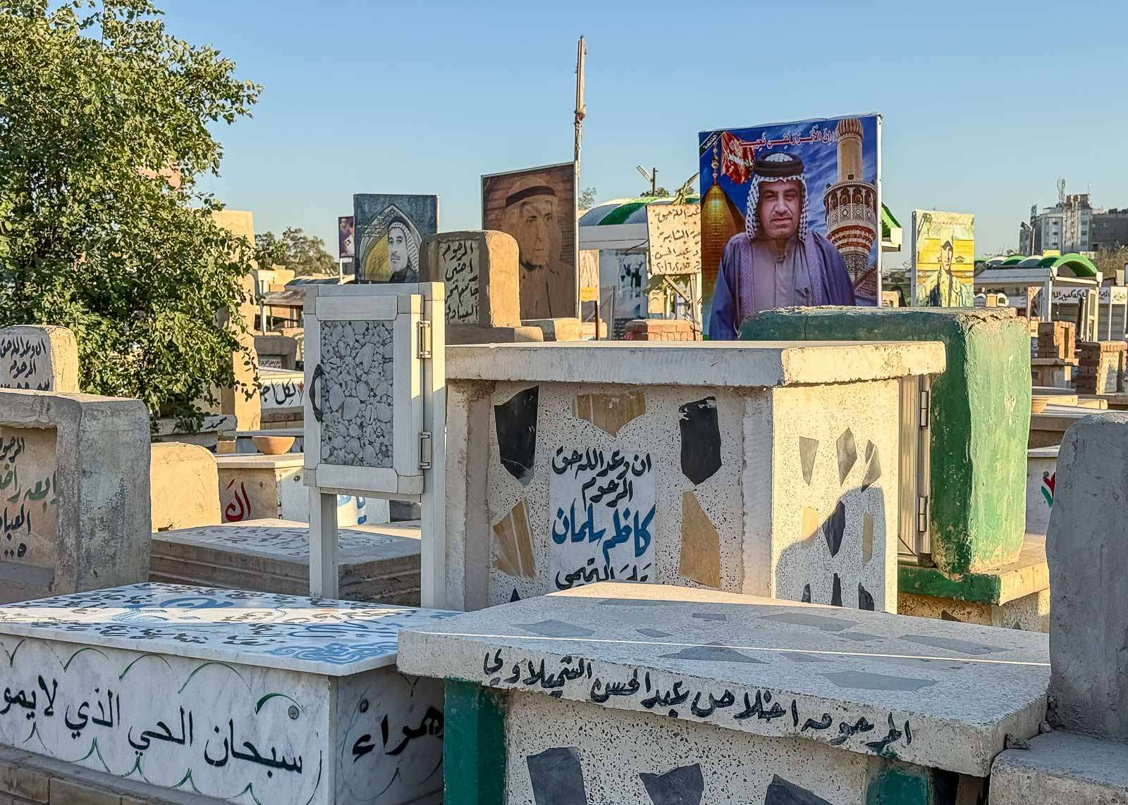 Ennen kuin päivän päätteeksi vierailimme Najafissa Iman Alin moskeijassa – osa ryhmästämme kävi myös täällä mausoleumilla asti – halukkaat saattoivat osallistua pieneen hautausmaakävelyyn. Tässä vaiheessa kaiken pyhyys oli jo uuvuttanut osan ryhmää ja he olivat valinneet iltapäivän kohteekseen Najafin ostoskeskuksen. Hautausmaalla kävely olikin ihan mielenkiintoinen. Hautoja on tietysti todella paljon, kaikkialle. Useimmat näkemämme olivat kivisiä laatikoita maan päällä, mutta joukossa oli myös pieniä mausoleumia. Lukittuja tietysti, mutta omaisilla on niihin avain, ja he voivat siis vierailla vainajiensa luona rauhassa sisätiloissa. Oppaamme kertoi, että monella perheellä ja suvulla on täällä oma tonttinsa, heilläkin. Samaan tapaan kuin meilläkin on parikin hautapaikkaa Helsingin Hietaniemessä.