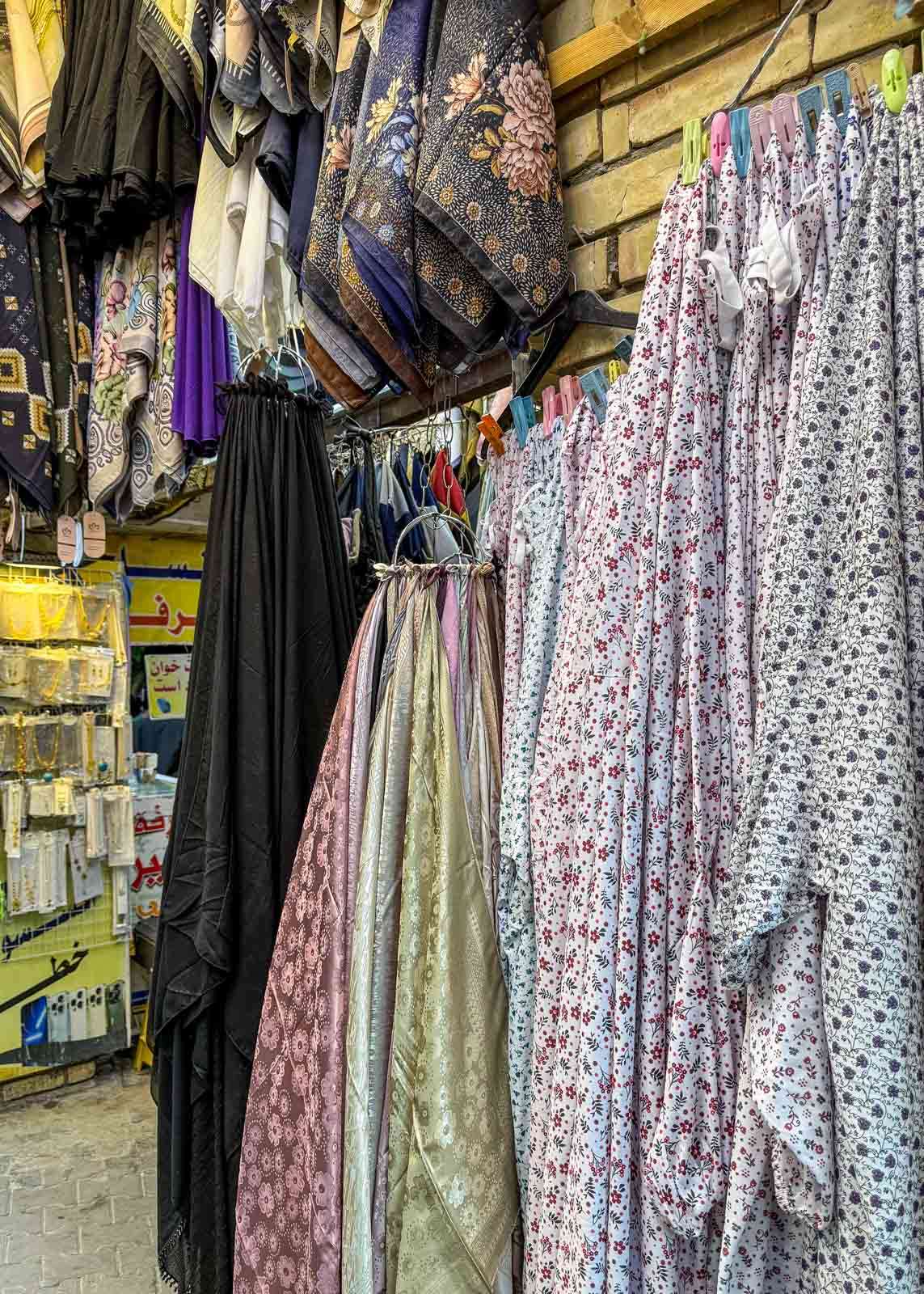 Hautausmaalta jatkoimme, mekin, moskeijalle, ja parin ensimmäisen turvatarkastuksen läpi isolle katetulle aukiolle moskeijan edustalla. Tänne pääsi riittävän peittävissä omissa vaatteissa ja miehet ja naiset – ja kokonaiset perheet – saivat kuljeskella tai oleskella alueella yhdessä. Aikamme Najafin moskeijaa tältä etäisyydeltä ihailtuamme (?) palasimme moskeija-alueelle vievälle kadulle ja tutustuimme sen reunoilla sijaitseviin lukuisiin pieniin kojuihin. Tarjolla oli ruokaa ja juomaa, (peittäviä) vaatteita tai vaikka lasten leluja.