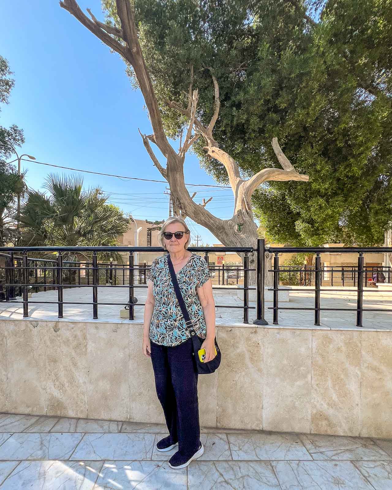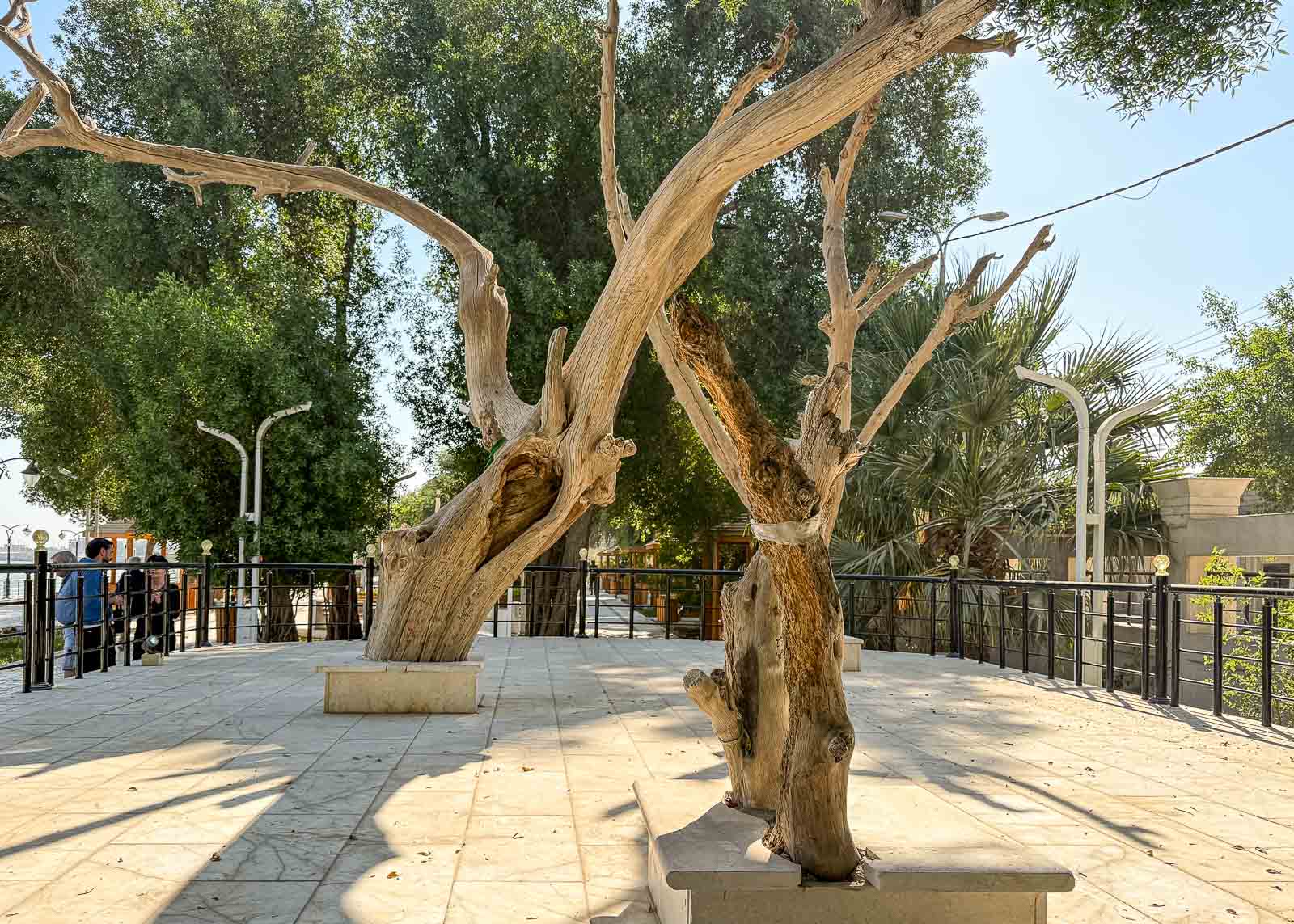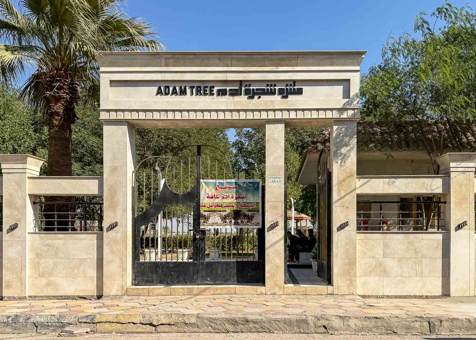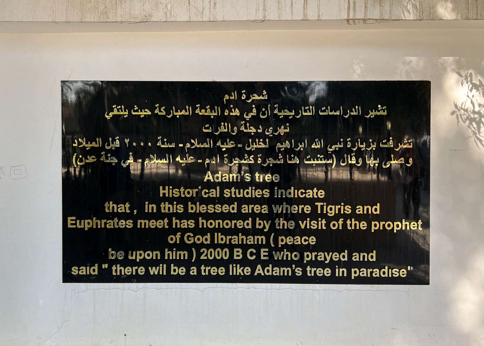 Onneksi Al-Qurnahissa on toinenkin nähtävyys. Käymme katsomassa pystyyn kuollutta puuta, jota väitetään Tiedon puuksi – tai ainakin sen jälkeläiseksi. Jokainen tuntenee tarinan Eevasta ja Aatamista ja puusta ja hedelmästä. Tämä se kuulemma on, se puu. Puu on kyllä entinen, eli se on kuollut jo kauan sitten, eikä lähistöllä ole puuta, jota väitettäisiin sen jälkeläiseksi. Vieressä oleva kyltti kertoo arabiaksi ja englanniksi tämän olevan Aatamin puun. Historioitsijat ovat yrittäneet haarukoida muinaisen Eedenin puutarhan sijaintia ja tämä maailmankolkka on ilmeisen vahvoilla, muidenkin kuin Irakin turismia mahdollisesti edistävien tahojen mielestä.