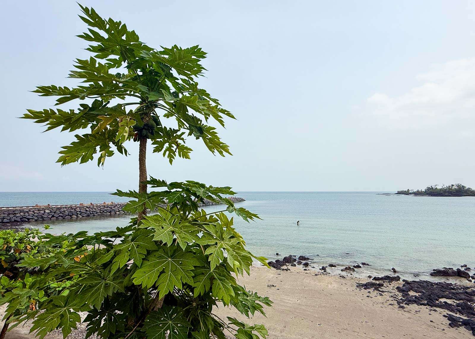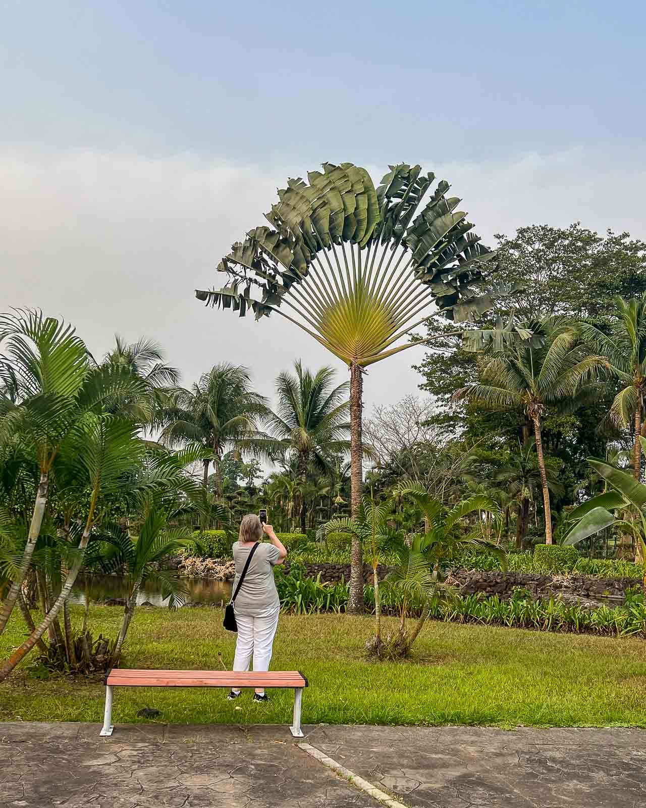 Täällä Lasse kiinnitti huomiota myös oikealta suomenkieliseltä nimeltään kai matkustajanpuuhun, joskin kutsuimme sitä matkailijanpalmuksi niin täällä kuin koko loppumatkan ajan – näimme samoja puita myös Gabonissa. Madagaskarilta kotoisin oleva ehkä enemmän banaaninsukuinen kasvi kuin palmu tunnetaan viuhkamaisesta lehvästöstään, joka kuulemma usein asettuu itä-länsi -akselille mahdollistaen näin jonkin tasoisen suunnistamisen. Netin mukaan lehtien tyviin kertyy myös vettä, jota matkailijat ovat käyttäneet hätävesilähteenä.