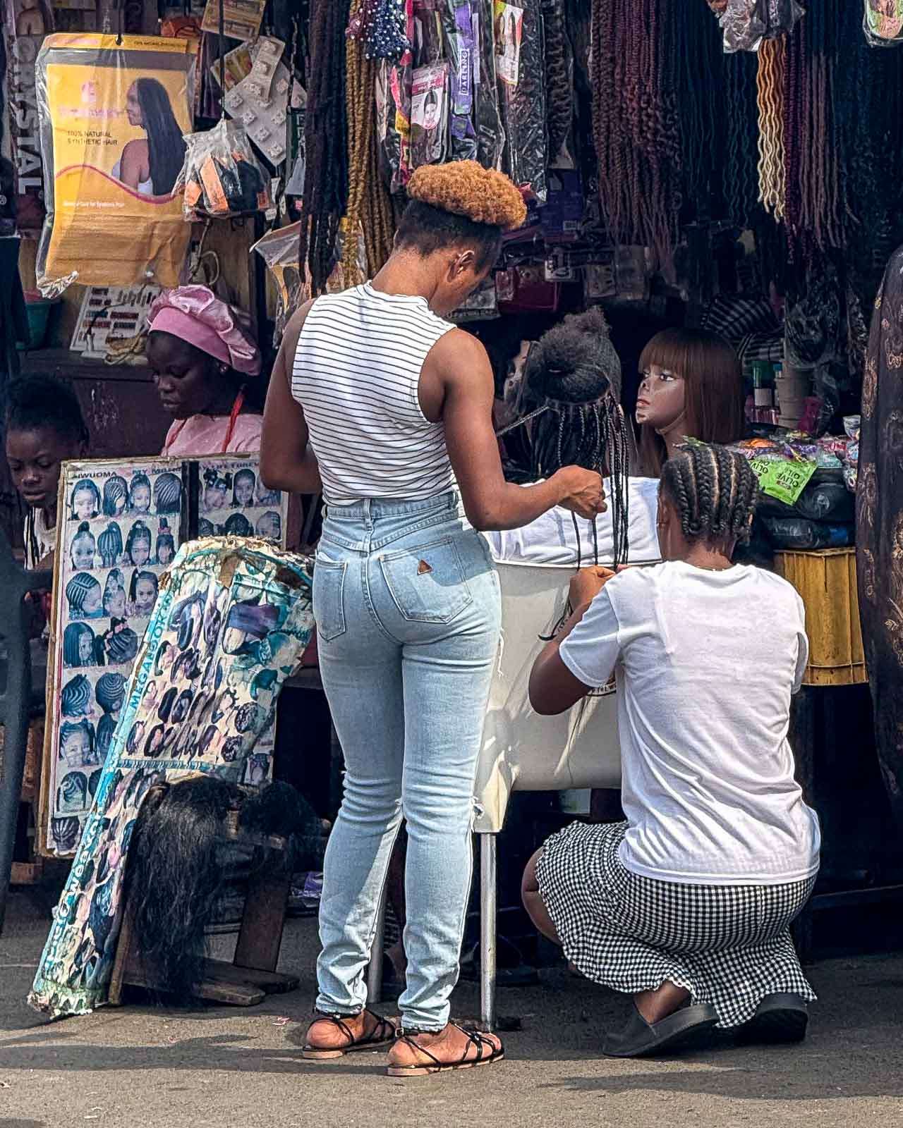 Kävelimme keskustassa myös joitakin katuja ajatuksena katsoa muutamia jäljellä olevia siirtomaa-aikaisia taloja. Kovin paljoa niitä ei ollut, eikä niiden kunnostukseen oltu mitenkään erityisesti panostettu. Keskustan liikkeistä oppaamme kertoi, että ne ovat pääasiassa ulkomaalaisten, senegalilaisten, nigerialaisten tai kamerunilaisten omistuksessa, sillä paikalliset eivät saa lupia harjoittaa yritystoimintaa. Diktaattorin suku haluaa kansan köyhänä ja nöyränä.
