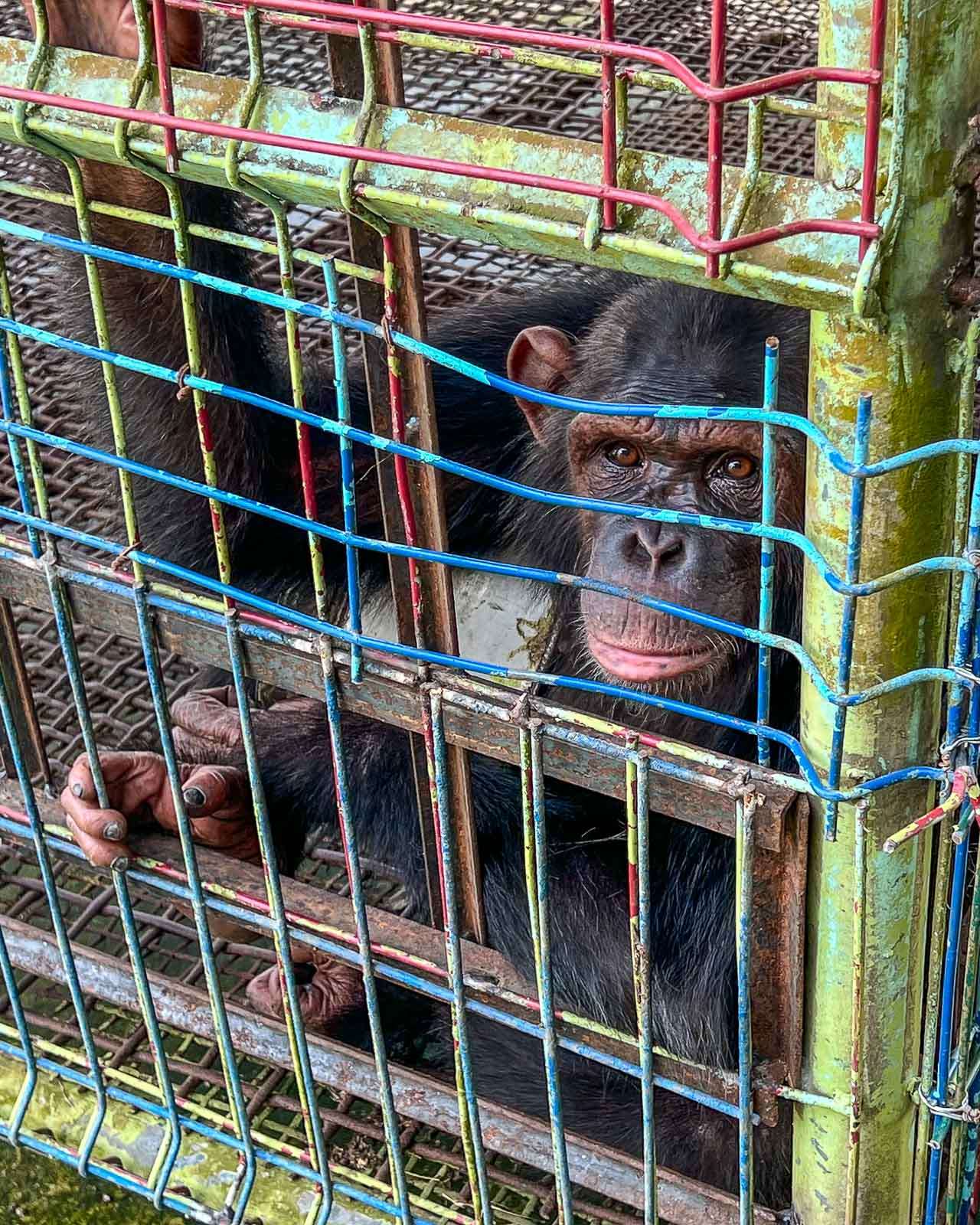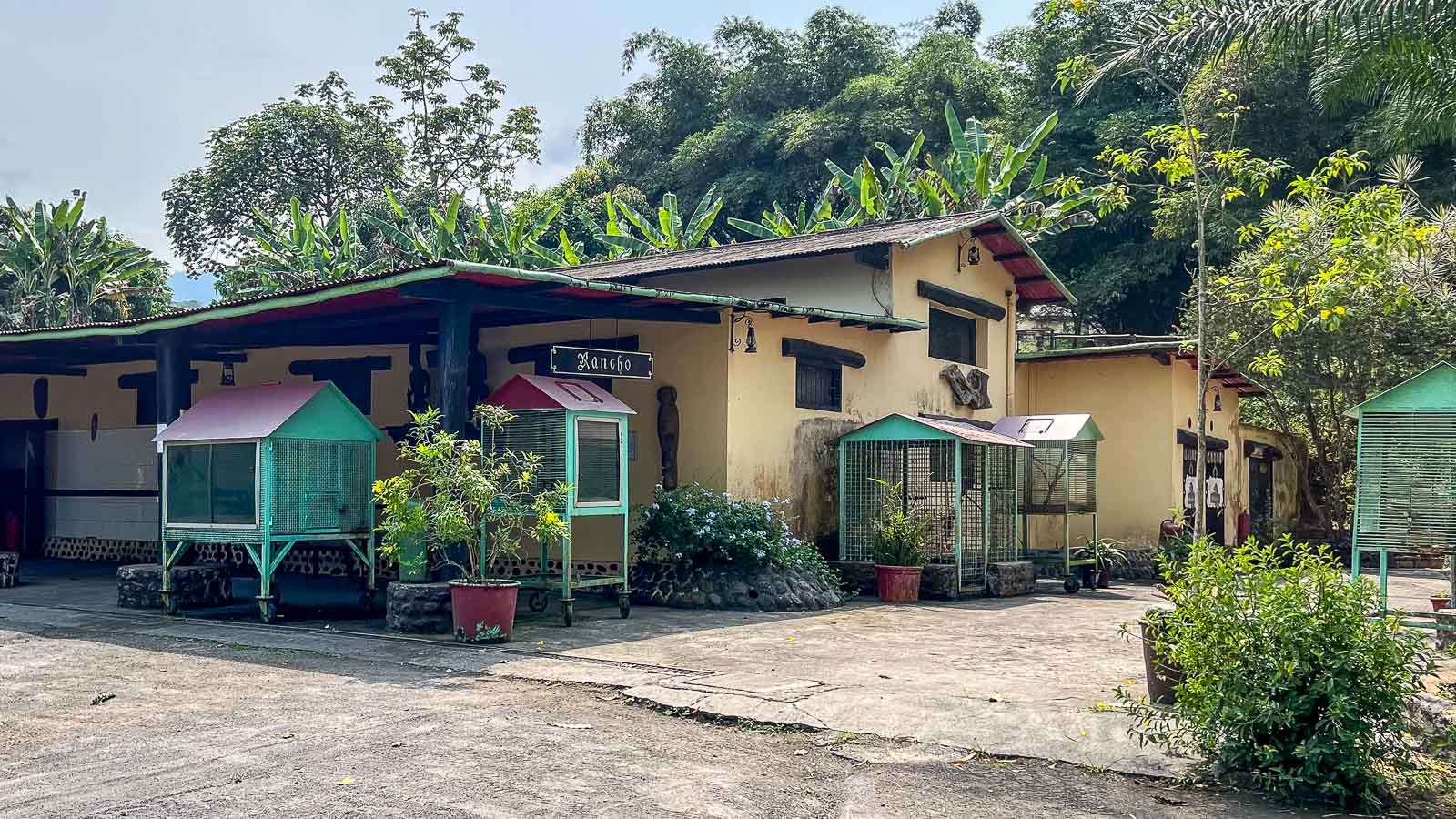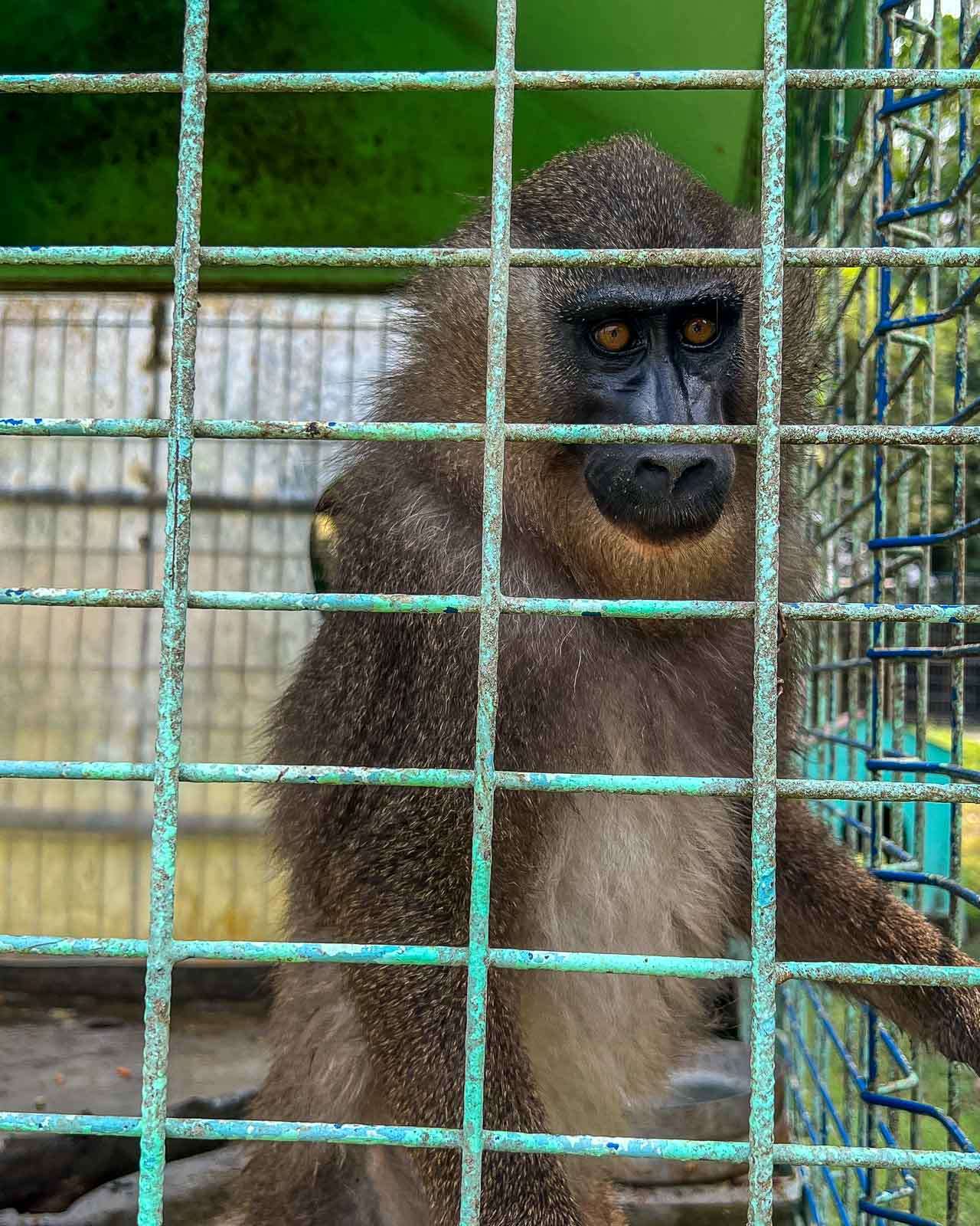 Finca Sampakan lähellä, tai ainakin kohtuuetäisyydellä siitä, oli El Ranchon pieni löytöeläinkeskus – tai ehkä sitä pitäisi vaan kutsua eläintarhaksi. Emme ainakaan vakuuttuneet siitä, että alueen pienissä häkeissä olevat apinat tai linnut olisivat matkalla takaisin luontoon. Toki voihan olla, että niiden elämä on täällä karvan verran parempaa kuin huonosti kohdeltuina koti- tai baarieläiminä, mutta kaukana oltiin vaikka Sierra Leonen Tacugaman simpanssien elinolosuhteista. Ja olivathan nämä apinat edelleen hengissä, monet lajitoverit ovat saattaneet joutua ruokapöytään. Kun kansa on köyhää, niin villieläinten lihakin kelpaa ruuaksi, siihen liittyvistä riskeistä huolimatta. Mitä niitä nyt olikaan, ebola, korona, …