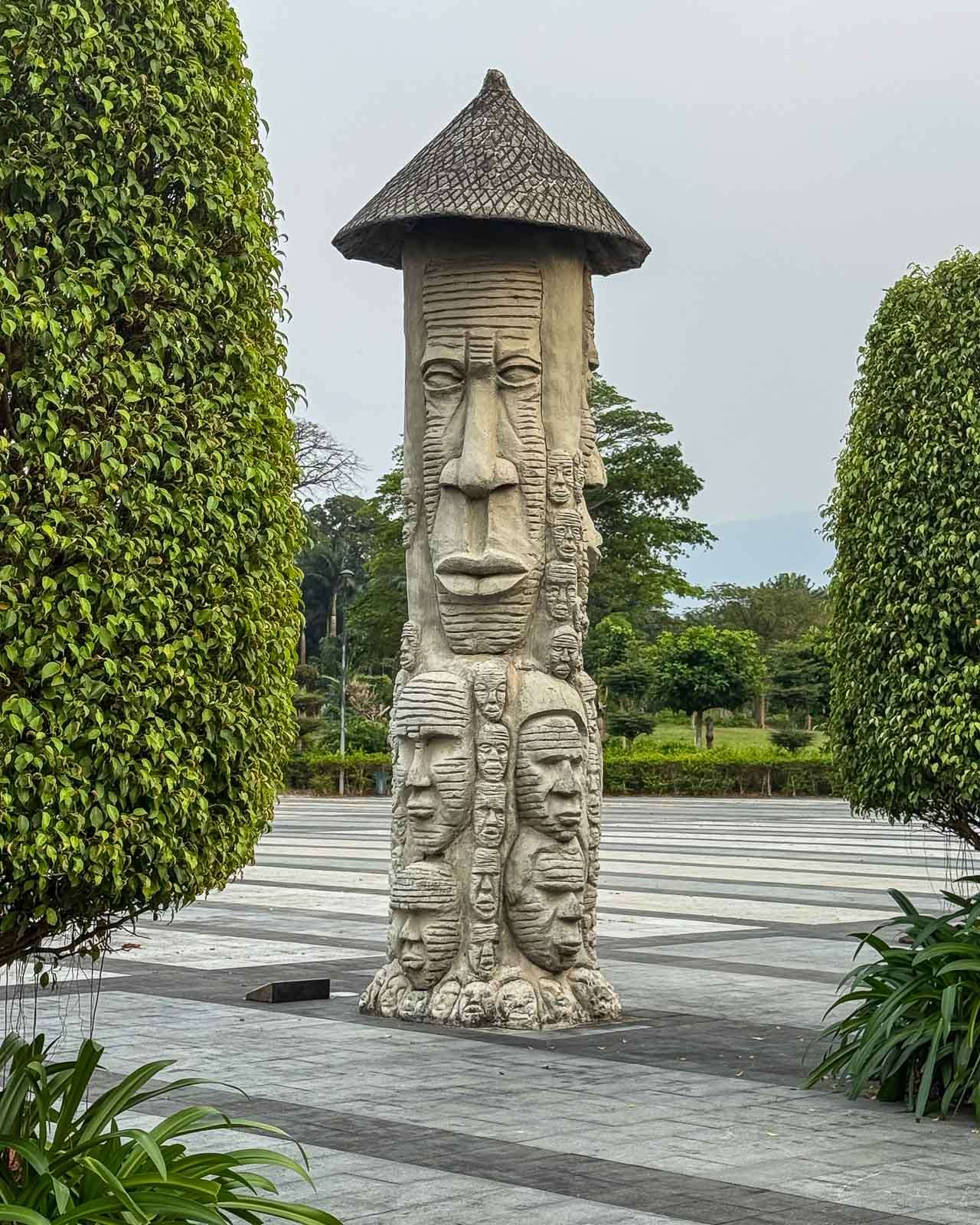 Puistossa on laajoja viheralueita, suoranaisia metsiä, mutta myös puistomaisia alueita, joissa puut kasvavat suorissa riveissä tai ainakin siten kun ne on aseteltu. On vesialueita, itämaiseen tyyliin punaisia isompia ja pienempiä siltoja ja paviljonkeja. Yhdellä laidalla on maan eri etnisiä ryhmiä patsaiden myötä kuvaava puisto ja sen lähellä teoriassa käsityötorikin, mutta parilla puistovierailulla emme nähneet siellä yhtään myyjää. Päiväntasaajan Guinean magneetin ostimme lentokentältä maasta poistuessamme, sillä se oli ensimmäinen ja ilmeisesti ainoa paikka, jossa moisia maassa oli myytävänä – näin paikallisoppaammekin mukaan.