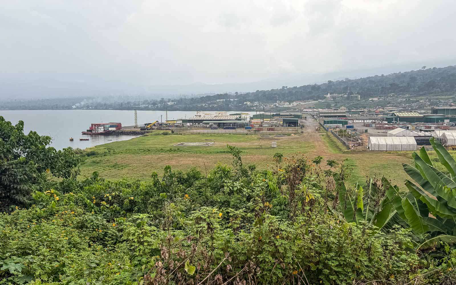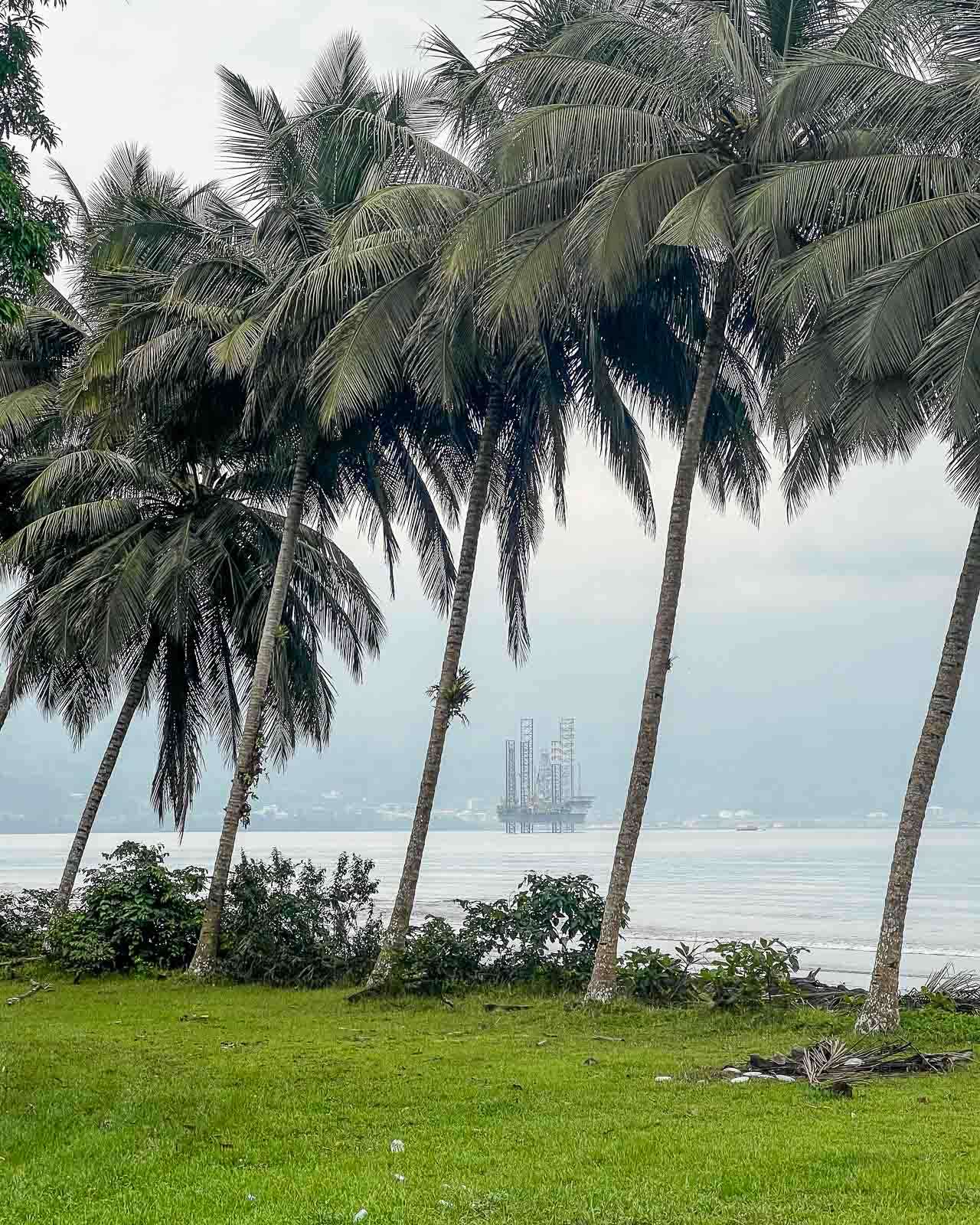 Lubassa poikkesimme myös rannalla sijaitsevassa pienessä kylässä. Merellä odotti muutama öljynporauslautta korjauksia. Ne muistuttivat siitä, kuinka suuri öljyteollisuuden rooli maassa on: Luba toimii tärkeänä huoltosatamana, ja Päiväntasaajan Guinea on Afrikan merkittäviä öljyntuottajia, vaikka matkailijalle maisema näyttäytyy usein hiljaisena ja jopa pysähtyneenä. Huoltosatama varmasti toimi, mutta itse Luban kaupunki oli vierailumme aikana ollut kuulemma jo neljä kuukautta ilman sähköä. Muutama asukas omisti aggregaatin ja muut latailivat sitten kännyköitään niiden tuottamalla sähköllä maksua vastaan. Välillä olemme ihmetelleet öljyä tuottavia valtioita, joissa jonotetaan bensiiniä, ja periaatteessa luulisi, että maalla olisi varaa tuottaa sähköäkin asukkailleen, mutta ilmeisesti jotain oli mennyt rikki, eikä diktaattorilla tai hänen suvullaan ole erityistä kiirettä sitä korjata.