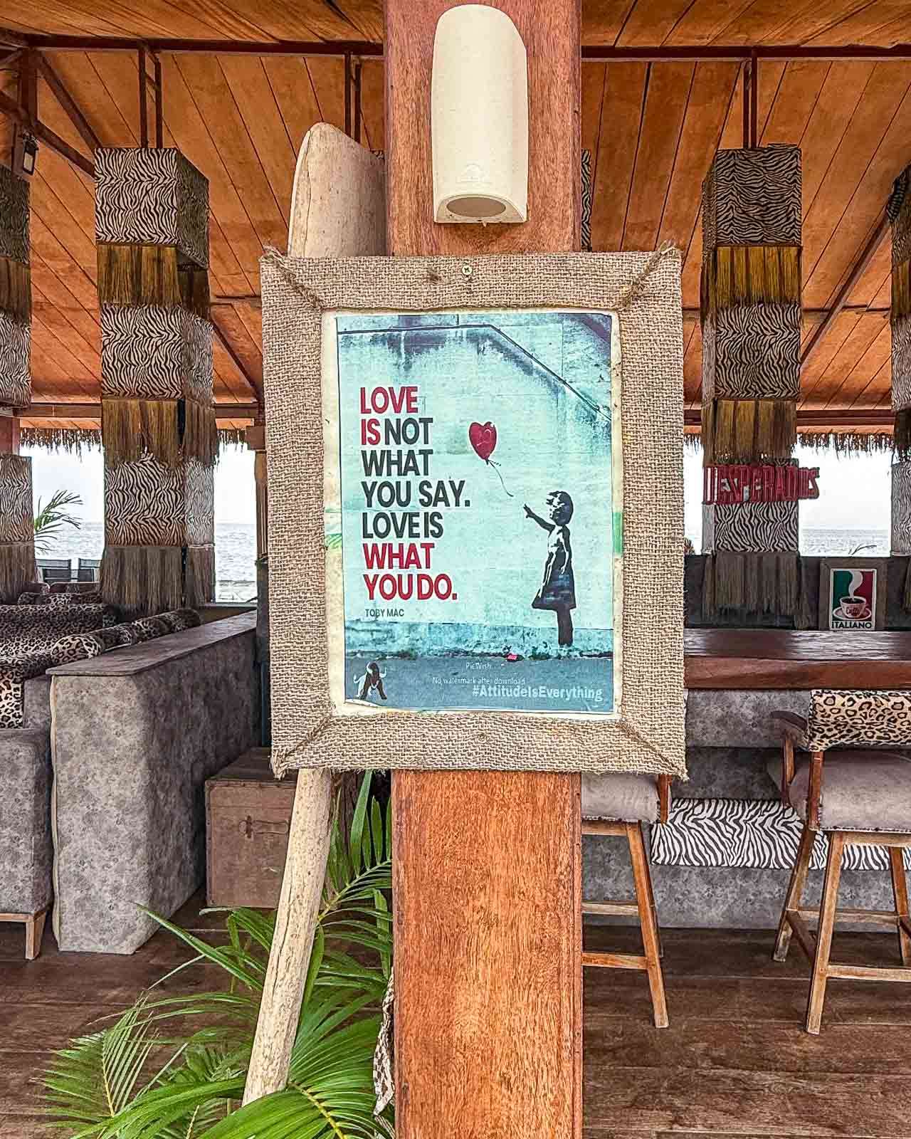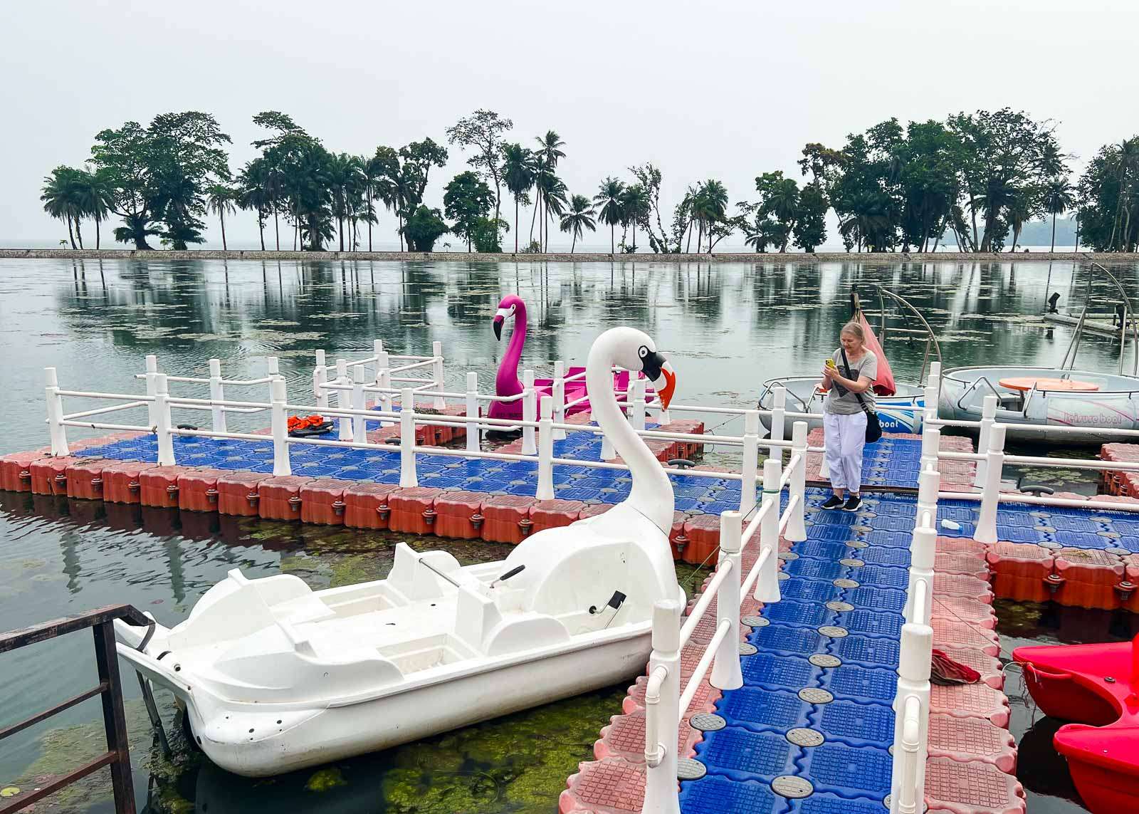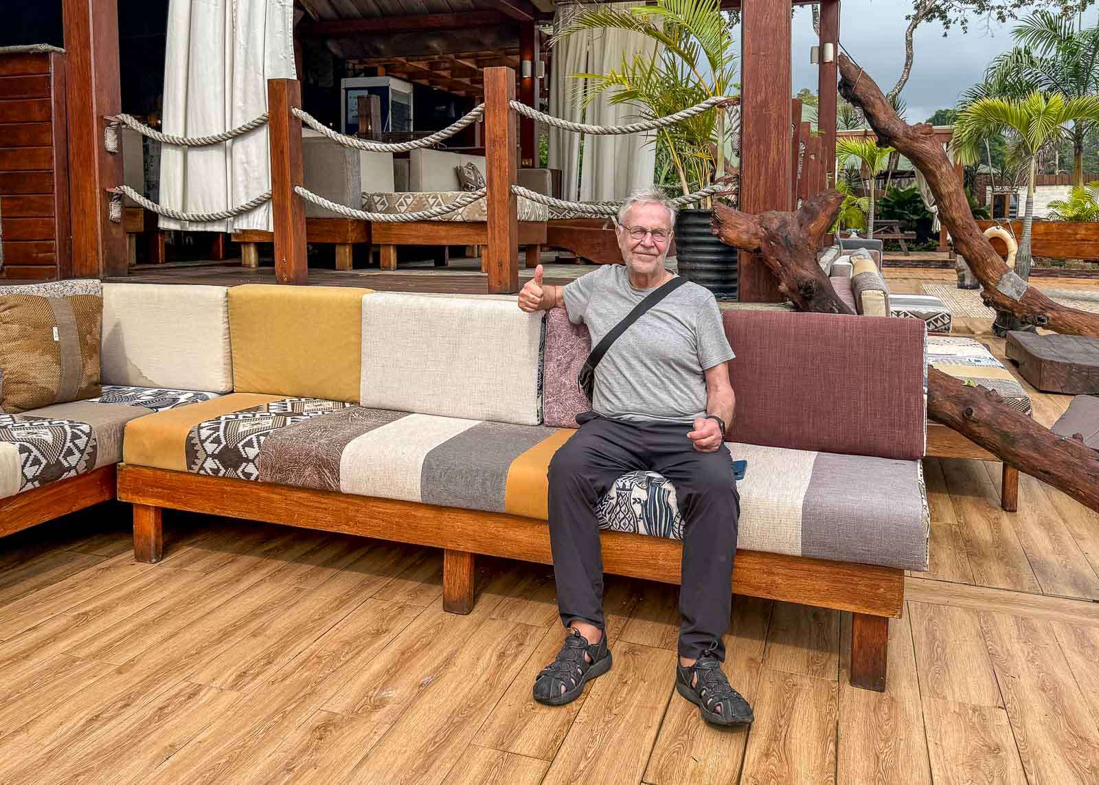 Alueella oli myös kivan tuntuinen rantabaari – ja siellä jopa muutama ihminen! Ilmeisesti kuitenkin ohikulkijoita kuten mekin, eivät alueella yöpyviä. No, emme mekään olisi halunneet yöpyä, autiossa resortissa oli jotain aavemaista. Malabon entisessä Hiltonissa, nykyisessä Bisila Palacessa, oli kuitenkin sen verran asiakkaita, että aamiaiselle, altaalle ja illalliselle riitti asiakkaita, ei ruuhkaksi asti, mutta emme kuitenkaan kokeneet olevamme isossa hotellissa yksin.
