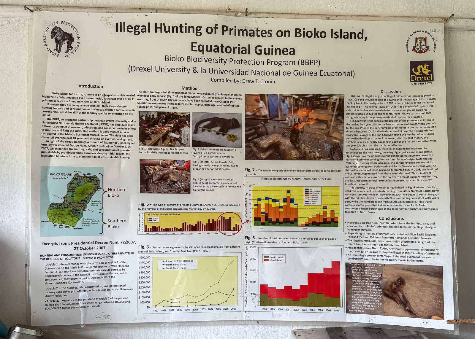 Vielä keskus oli kuitenkin auki ja kertoi ihan mukavalla tavalla Biokon saaren niin historiasta kuin luonnostakin. Pienten apinoiden kallojen rinnalla tilan seinällä oli vanhoja julisteita, joissa käsiteltiin villieläinten syöntiä ja sen kehitystä, ehkä trendi kuitenkin sentään täälläkin on hienoisesti laskeva kansan vaikeasta tilanteesta huolimatta. Apinoiden syöminenhän ei ole kovin hyvä idea, ei apinan eikä ihmisen kannalta, sillä vaikka ebola ei ole kovin kiva tauti.