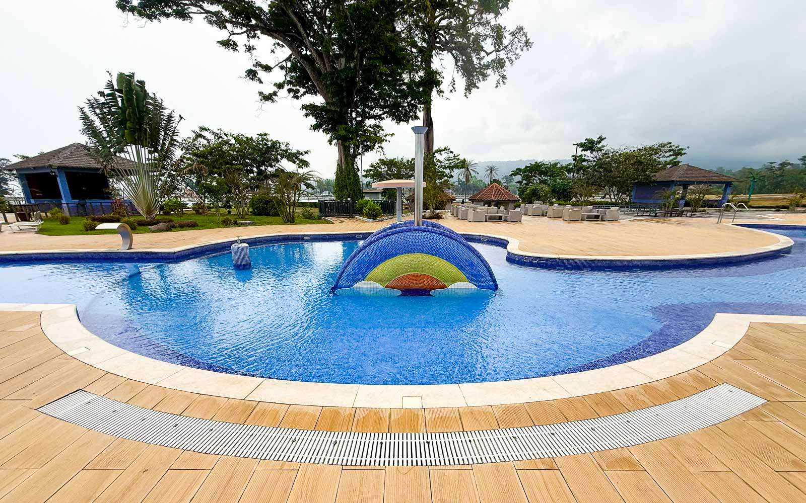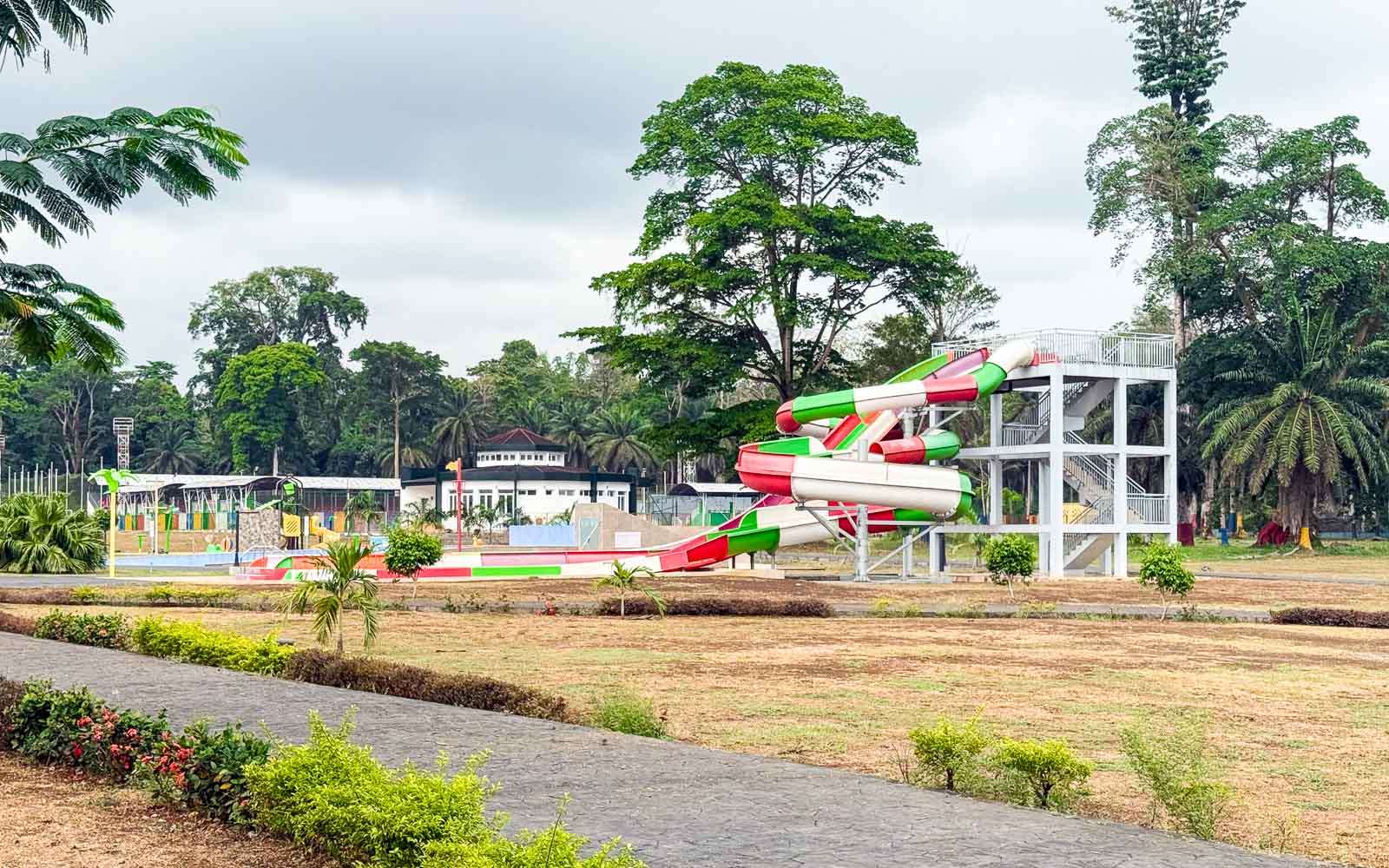 Riabassakaan ihmisiä ei ollut mitenkään häiriöksi asti. Syystä tai toisesta oppaamme halusi kierrättää meitä autiossa resortissa. Ison uima-allasalueen ympärillä oli tarjolla bungaloweja ja vähän kauempana vesiliukumäkiä ja lapsille tarkoitettu puisto. Kaikkialla oli siistiä, mutta ihmisiä ei ollut. Oppaamme mukaan toisaalta ihmisillä ei ole rahaa, toisaalta vaikka olisi, niin he eivät halua tukea diktaattorin suvun liiketoimia. Rahaa kun on, niin sillä, käytetäänkö näitä resortteja juuri nyt tai ei, ei ole niin väliä. Aluetta kuitenkin ylläpidetään hyvin, kuulemma huolto- ja siivoushenkilökunta on pääosin Marokosta, jostain syystä. Välillä alueella saattaa olla joku seurue juhlimassa jotain – vaikkapa näiden marokkolaisten työntekijöiden sukua.