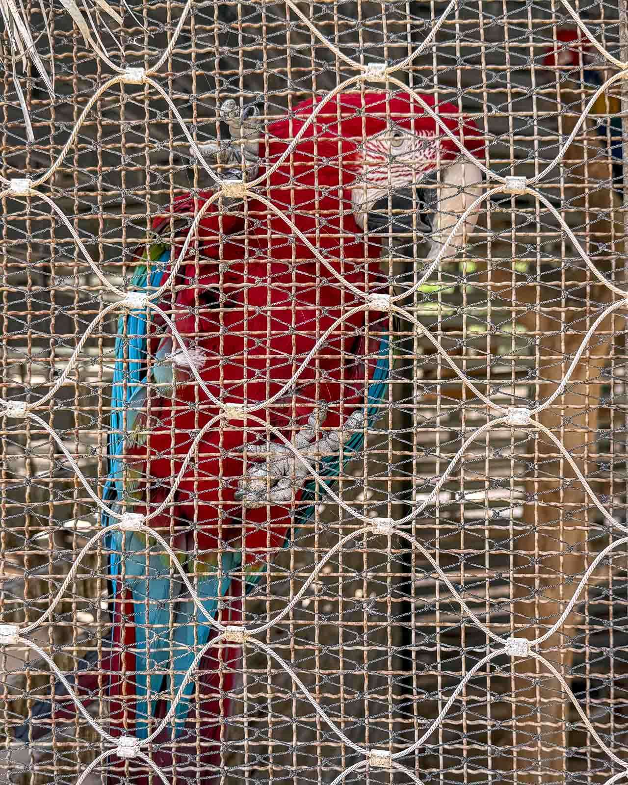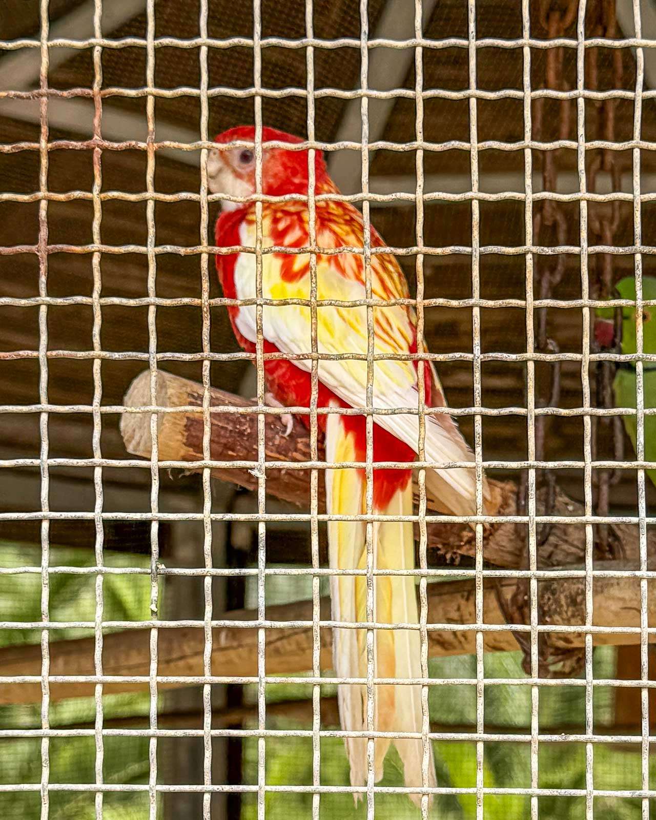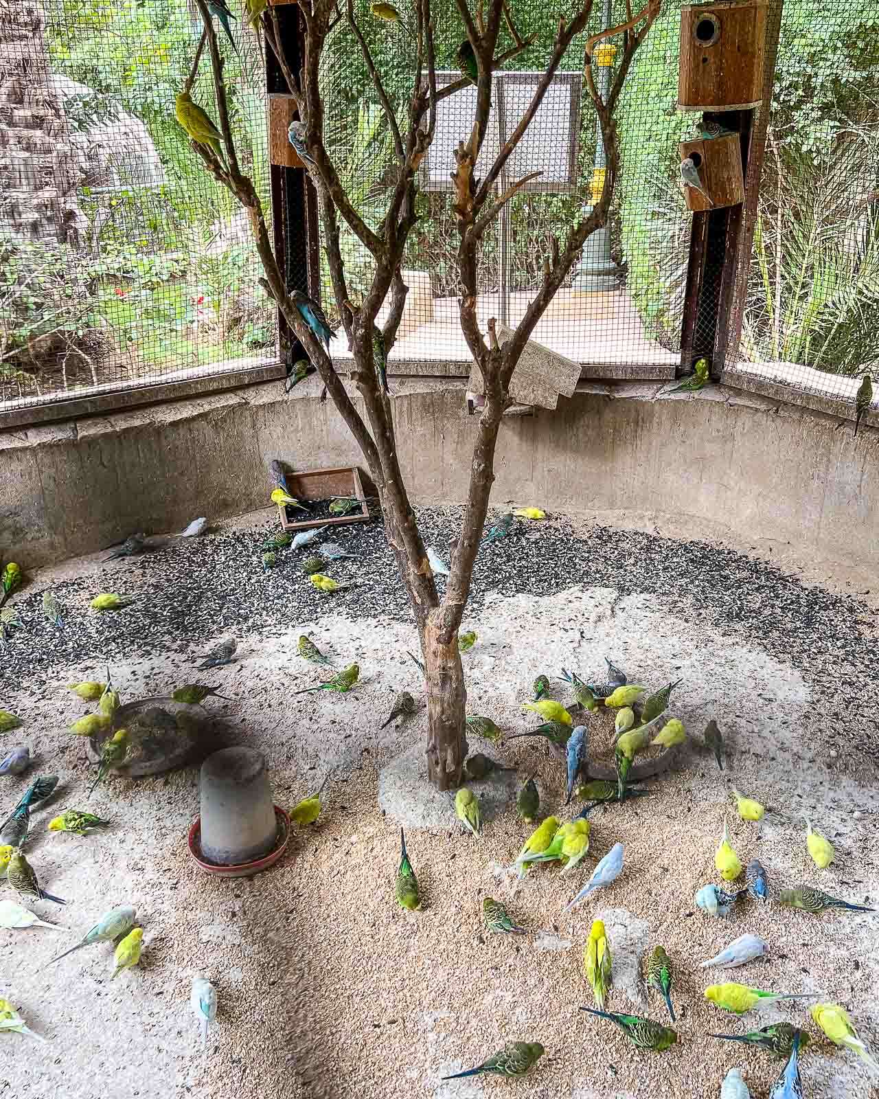 Aloitimme vasemmalta, jossa lintulistan mukaan pitäisi löytyä ainakin ara-papukaijoja ja undulaatteja. Isoja papukaijoja oli tietysti lukumääräisesti vähemmän kuin pieniä lintuja ja lisäksi ne oli verkotettu parhaimmillaan kolmeen kertaan, joten niitä ei melkein nähnytkään. Undulaattien häkissä oli tarkoituksella tai “aktiivisten” kävijöiden toimesta purettu ulommaista verkkoa yhdeltä suunnalta sen verran, että kännykän linssin saattoi saada soviteltua verkkoon nähden niin, että lintujen kuvaaminenkin oli mahdollista.