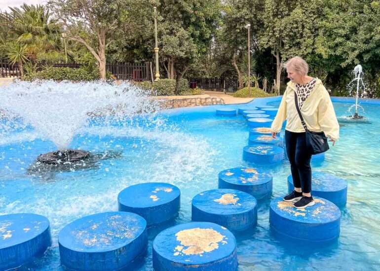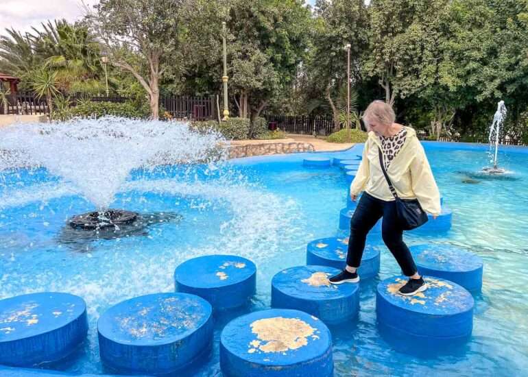 Puiston keskialueella oli vesiputouksia ja muita vesielementtejä kaikkien kävijöiden iloksi. Vesialtaan poikki rohkeimmat olisivat saattaneet edetä hyppelemällä pieneltä tasolta toiselle, mutta totesin, että parissa välissä välimatkaa oli sen verran, etten ota riskiä :-) Leikkipuistokin olisi ollut, mutta aikuiskävijöitä meille riitti tuo leikki vesialtaassa. Olimme muuten juuri käyntimme aikaan luultavasti ainoat vierailijat puistossa joskin meitä ennen puistossa oli ollut kävijöitä ja meidän jälkeemme sinne oli tulossa ainakin yksi perhe. Puolivälissä käyntiämme huomasimme, että puiston suihkulähteet heräsivät henkiin, ehkä ajastuksella, mutta saattoi myös olla, että puiston henkilökunta (=lipunmyyjä näin sunnuntai-iltapäivällä) päätti, että meidän pitää saada vastinetta pääsymaksullemme myös suihkulähteiden osalta :-)