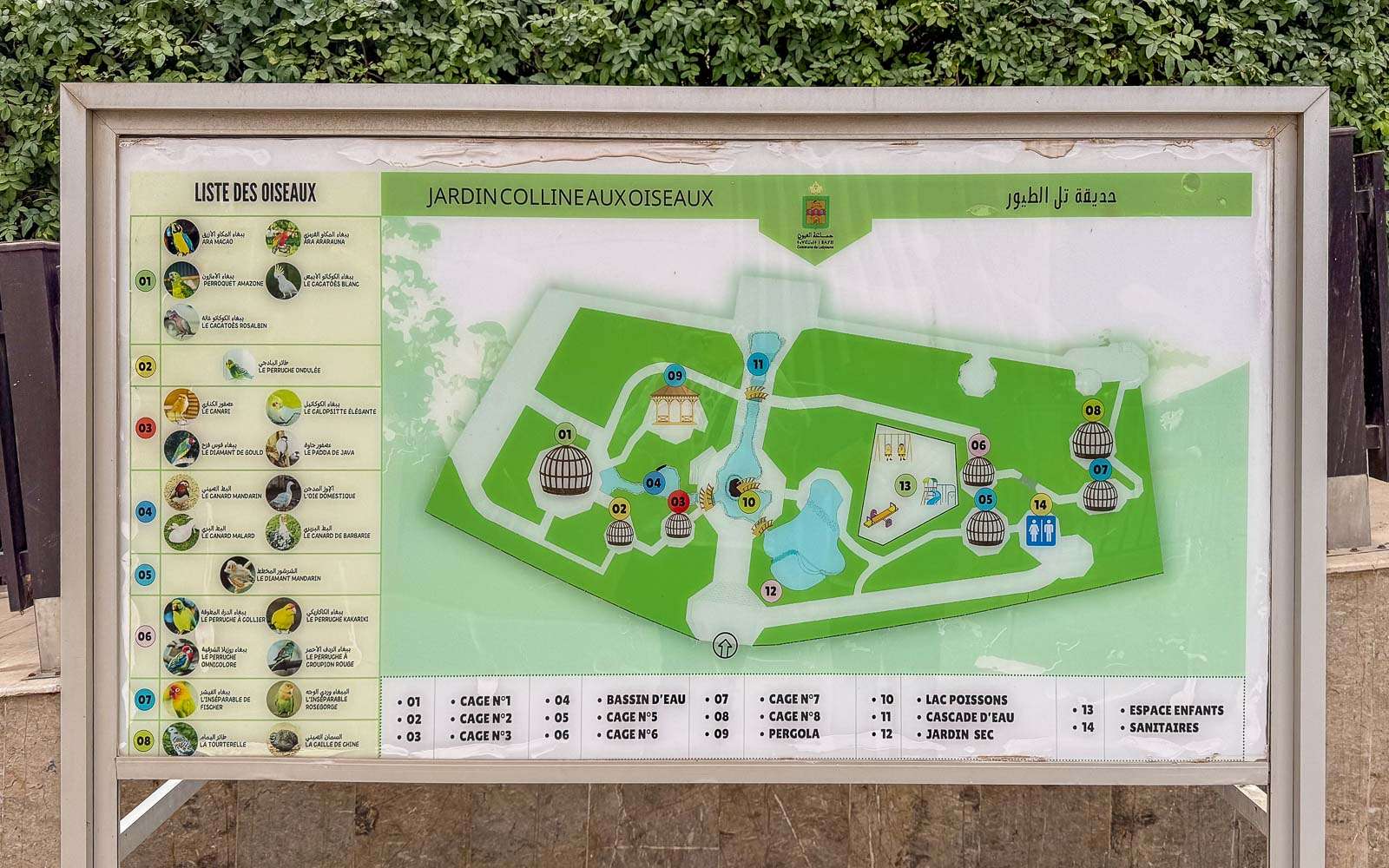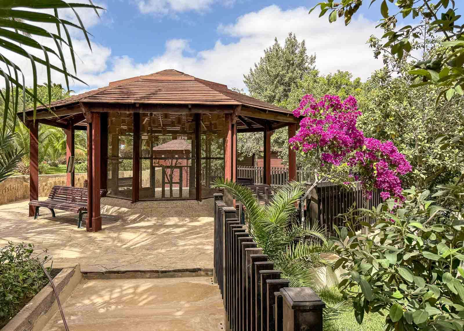 Lähdimme siis kävelemään soikion muotoista korttelia ympäri vastapäivään. Aika pian vastaamme tuli isä parin lapsensa kanssa ja jotenkin vaistoni sanoi, että he muuten ovat täällä lintupuiston takia. Eikä aikaakaan kun saavuimme mekin lintupuiston ovelle – sinne pääsee siis sisään tältä reunalta – ja meidän ja lintupuiston välillä oli enää pääsymaksusta selviäminen. Olimme kuitenkin jo heti hotelliin kirjautumisen jälkeen poikenneet läheisellä pankkiautomaatilla nostamassa pienen määrän dirhameja selvitäksemme käteisellä suoritettavasta turistiverosta ja sen tiimoilta meillä oli dirhameja tuo huikea summa, eli 10 dirhamia (n. 1 euro) kahdelta. Saimme liput ja lintupuisto oli meille auki!