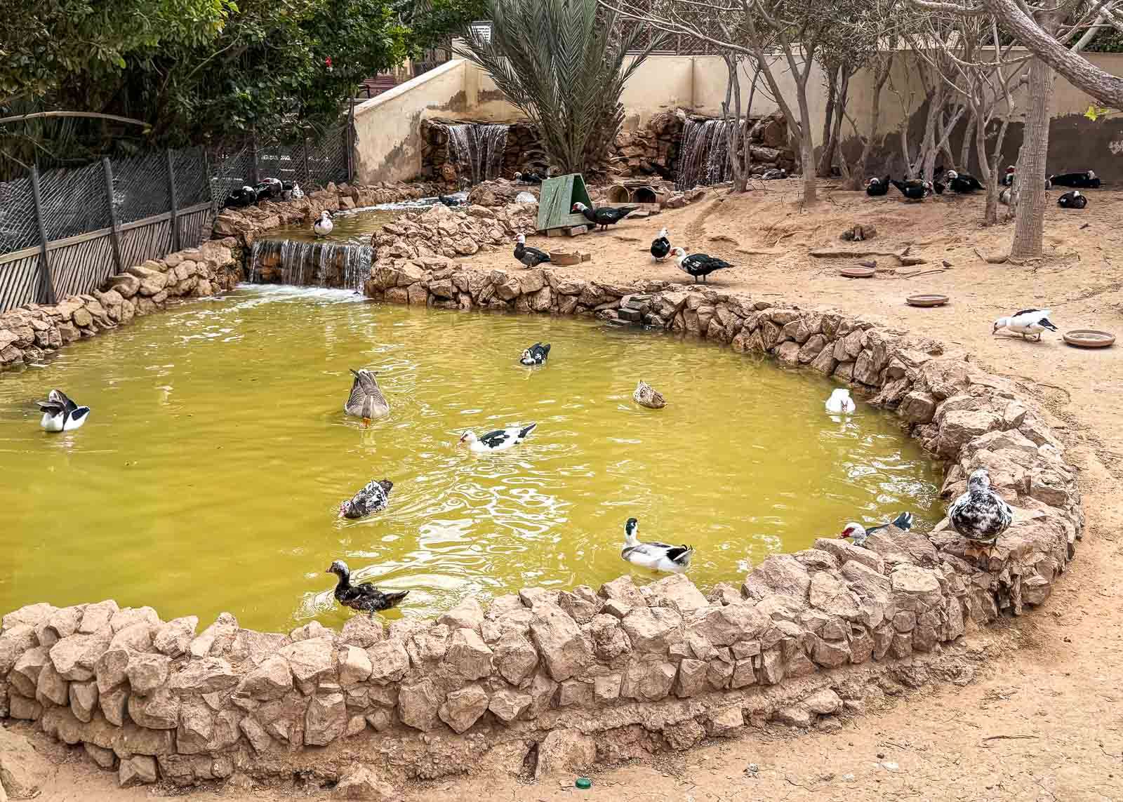 Ensimmäisenä puistossa olivat vesilinnut. Ok, ehkä tuo aitaus näyttää vähän ankealta, mutta pitää muistaa, että tämä on afrikkalainen lintutarha ja sen myötä resurssit ja osaaminen saattaa olla rajallista – Marokollakin, joka miehittää Länsi-Saharaa, saattaa olla muitakin rahareikiä. Mutta hei, onhan näillä kivoja vesiputouksiakin!