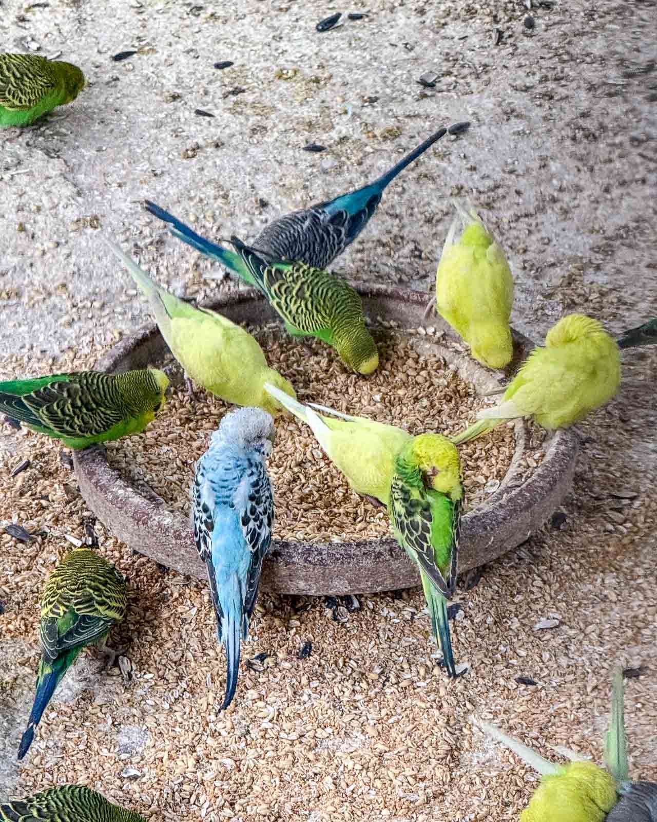 Toisella puolella olevista häkeistä parissa oli runsaasti lintuja, yhdessä kyyhötti yksi vaalea lintu ehkä yksinään ja jätimmekin sen sitten rauhaan. Parakeetteja sen sijaan seurailimme vähän pitempäänkin, tosin niillä taisi olla enemmän asiaa toisilleen kuin meille.