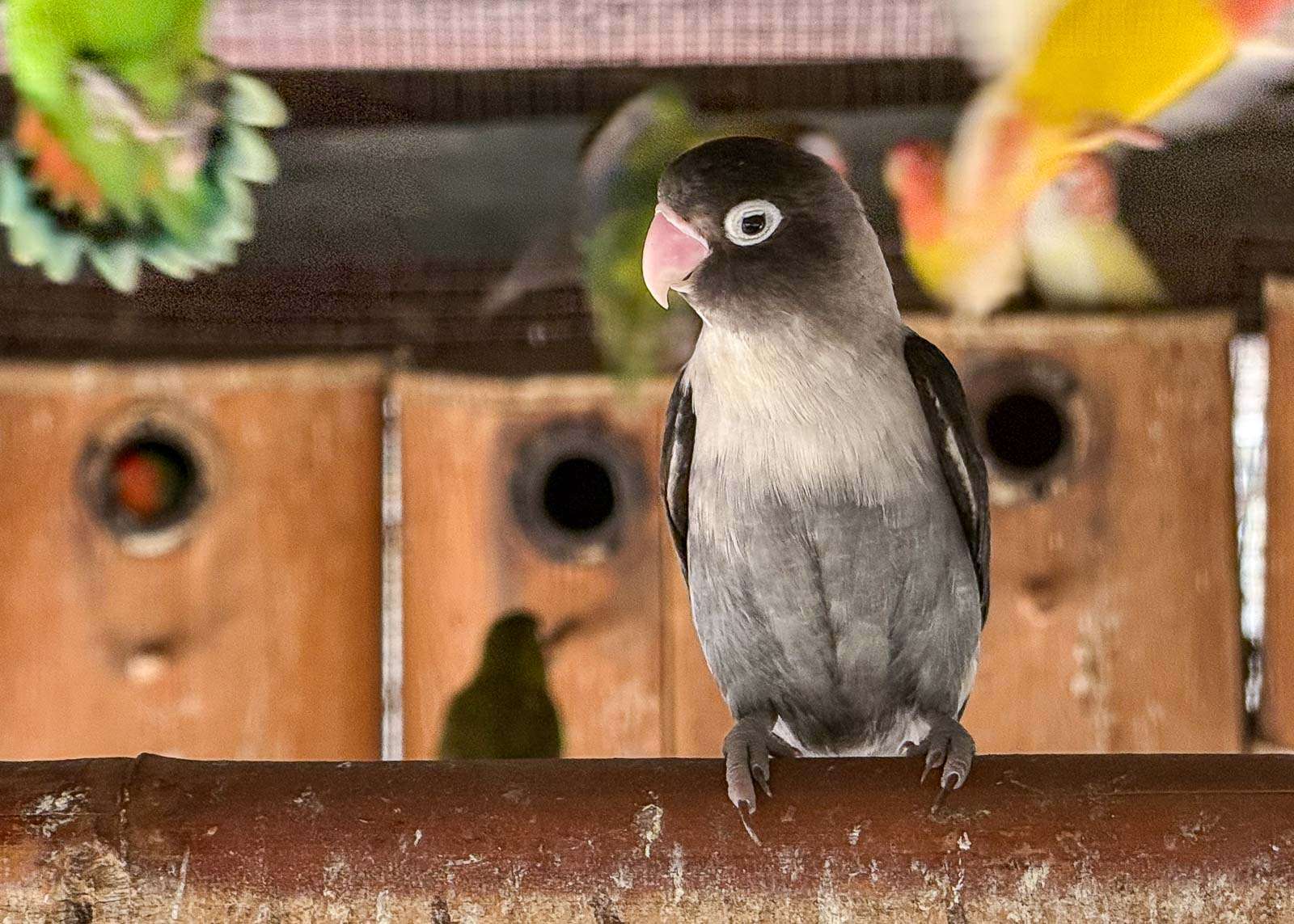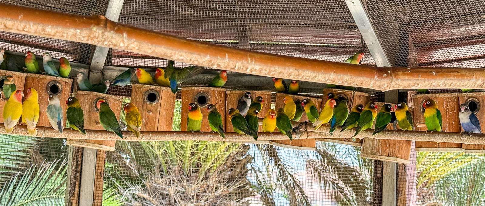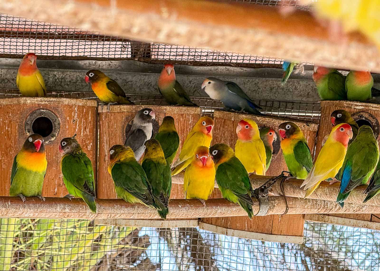 Rakkauspapukaijoja (englanniksi Love Birds, suomeksi myös kaijaset) häkissä olikin varsinainen kolonna lintuja. En osaa sanoa, että oliko niitä jo häkin kokoon nähden liikaakin, mutta paljon niitä oli. Ehkä ne nimensä mukaisesti pitävät seurasta eivätkä tykänneet huonoa siitä, että niitä oli niin paljon!