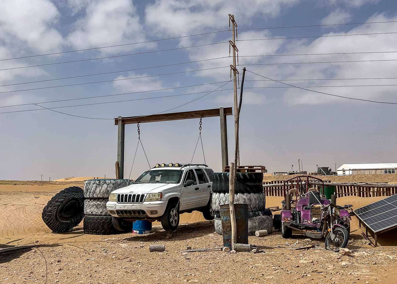 Heti kaupungin ulkopuolella tien varressa sijaitsi jonkinlainen seikkailupuisto. Pyörähdimme sen pihassa, mutta lopulta totesimme, että päivä oli tuulinen ja ilmassa oli sen verran hiekkaa, ettemme viitsineet kävellä pitemmälle puistoon parin kamelin takia. Kameliratsastusta emme edes harkinneet. Kokemuspuolelle jäi jostain syystä ilmaan roikkumaan nostettu auto.