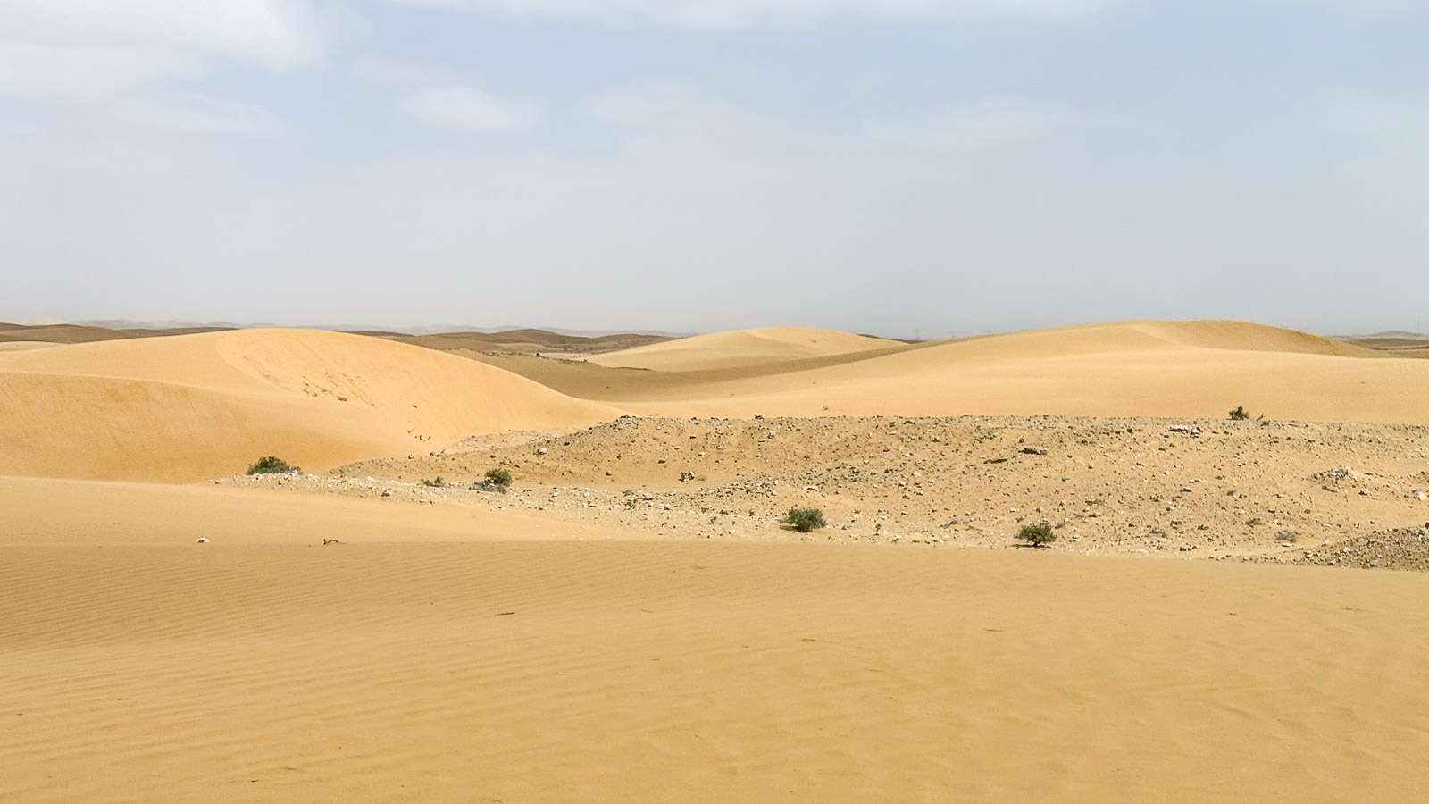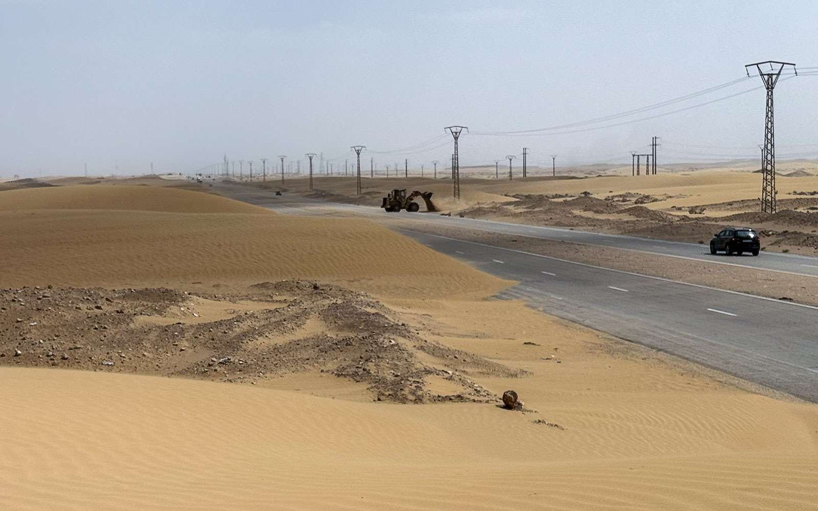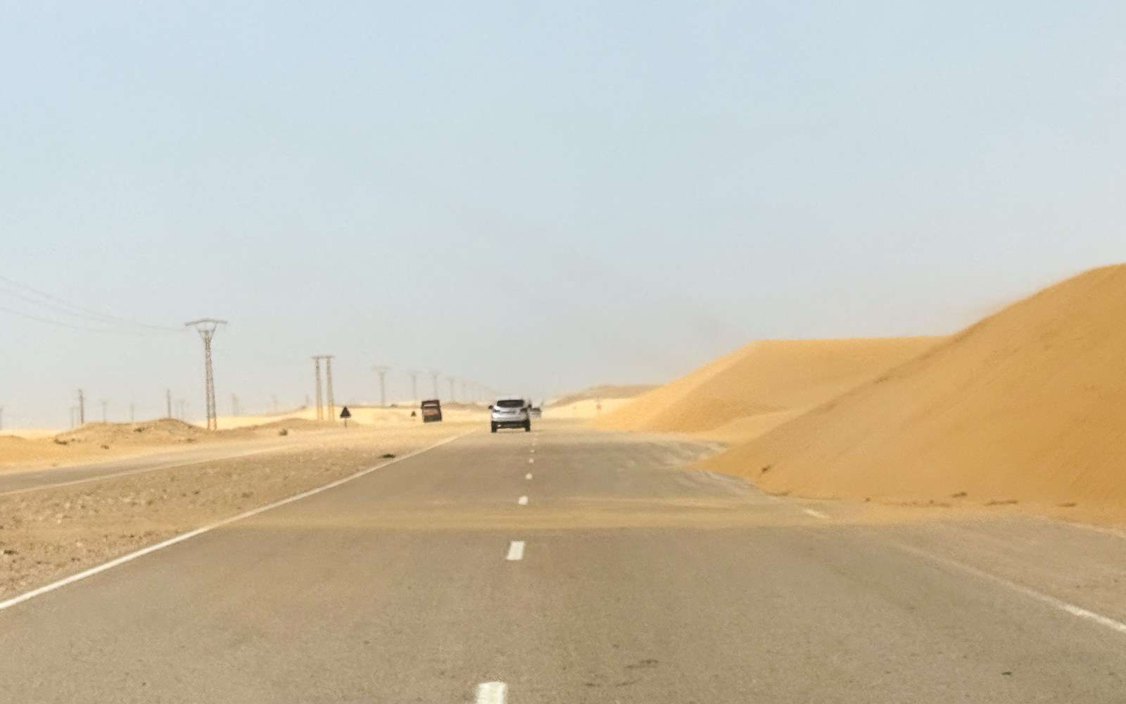 Kun kaupunki jäi taakse, maisema muuttui nopeasti. Tie kulki halki avoimen hiekka-aavikon, ja sen molemmille puolille alkoi kohota hiekkadyynejä – ensin matalampina kumpareina, sitten yhä suurempina. Hetkittäin tuntui melkein kuin olisimme ajaneet keskellä talvista Suomea: dyynit muodostivat tien reunoille pitkiä valleja aivan kuin lumipenkat Suomen talvessa.