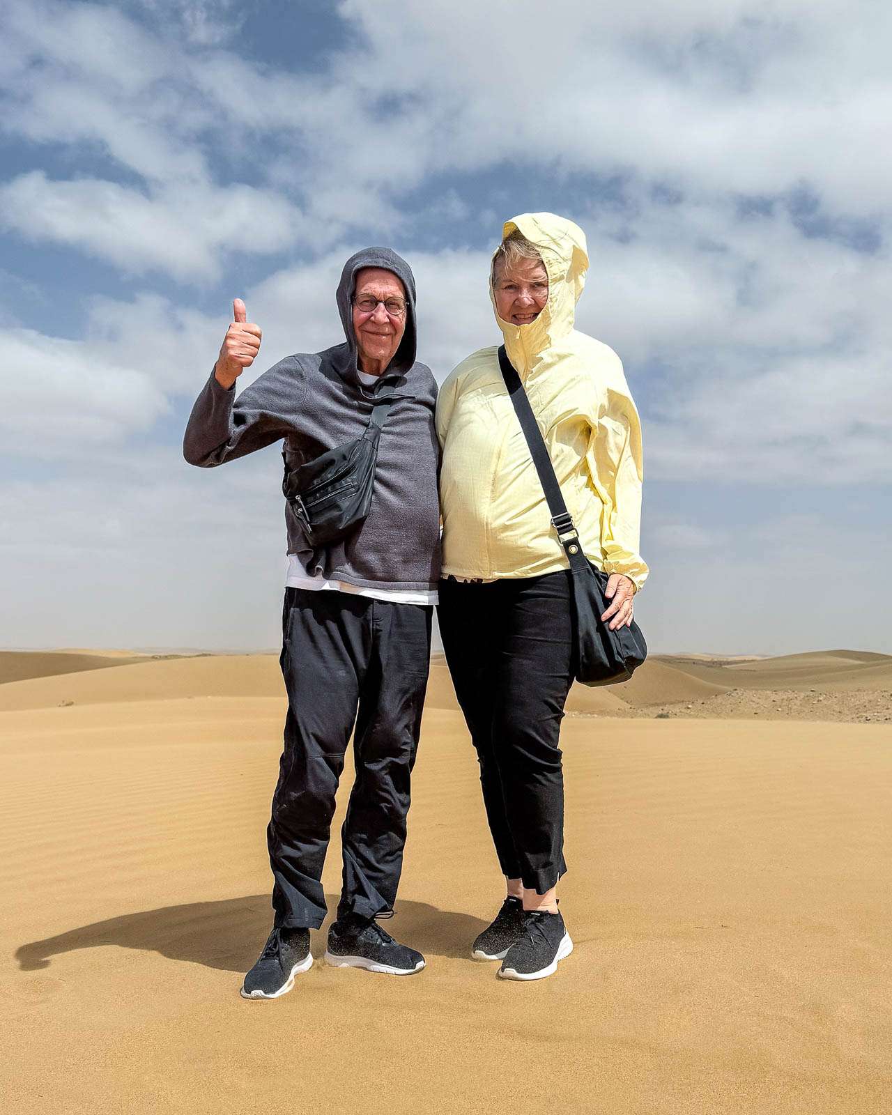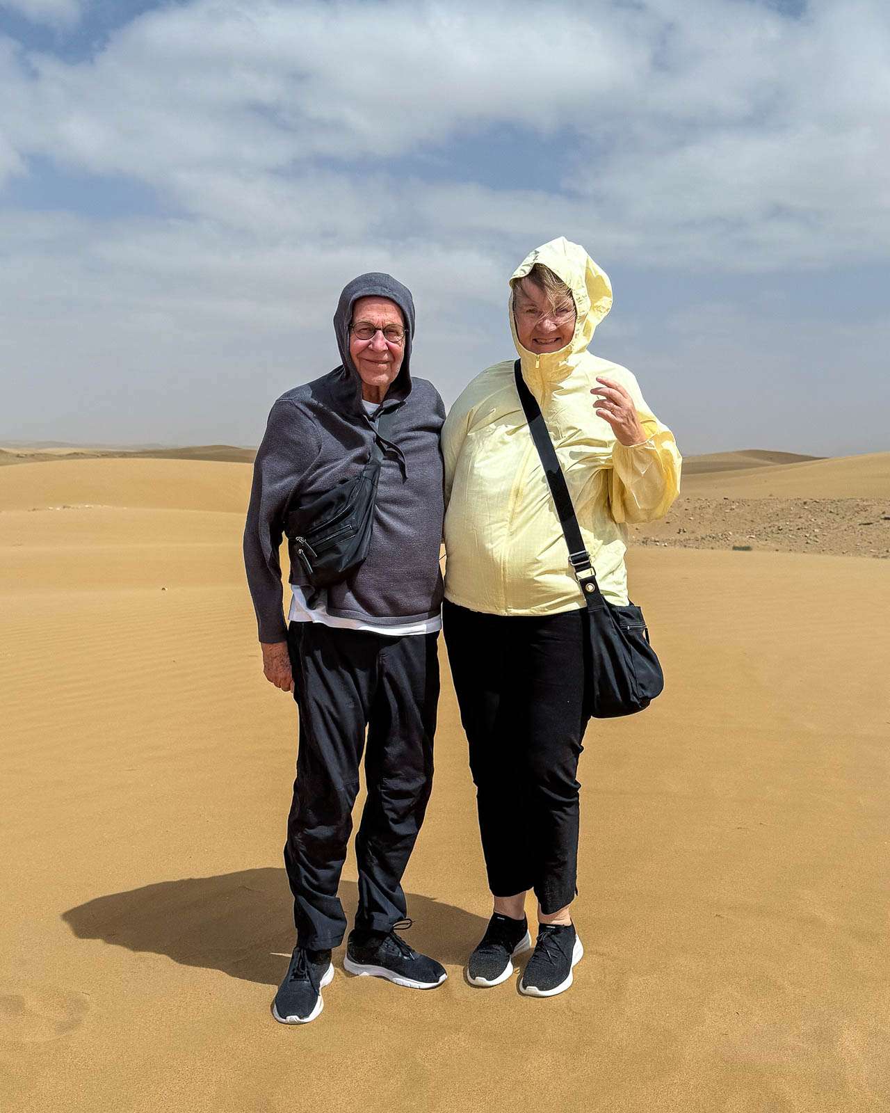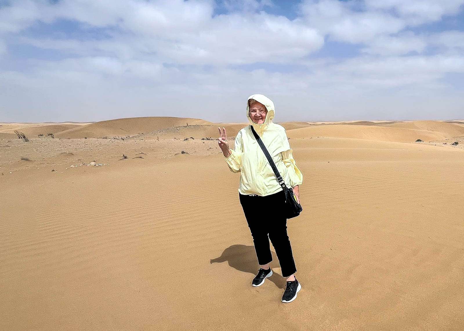 Kun kaupunki jäi taakse, maisema muuttui nopeasti. Tie kulki halki avoimen hiekka-aavikon, ja sen molemmille puolille alkoi kohota hiekkadyynejä – ensin matalampina kumpareina, sitten yhä suurempina. Hetkittäin tuntui melkein kuin olisimme ajaneet keskellä talvista Suomea: dyynit muodostivat tien reunoille pitkiä valleja aivan kuin lumipenkat Suomen talvessa.