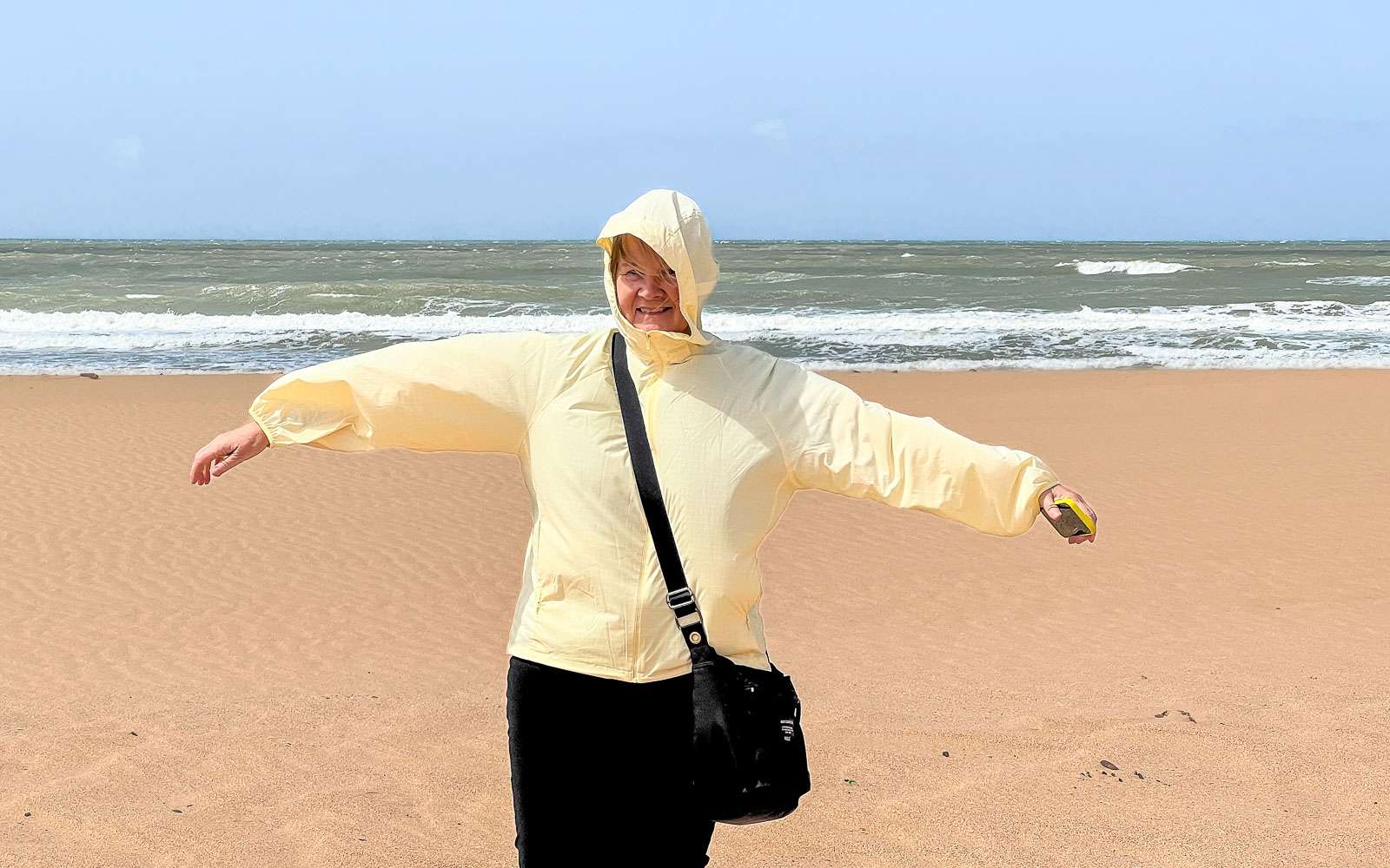 Vaikka tuuli oli kova, pysähdyimme hetkeksi ja kiipesimme lähimmälle dyynille ottamaan muutaman kuvan. Hiekka oli yllättävän kovaa ja tiivistä – ei lainkaan niin upottavaa kuin olin kuvitellut. Askeleet eivät vajonneet juuri lainkaan hiekkaan, vaan dyynin rinnettä pitkin pystyi kävelemään melkein kuin kovalla hiekkarannalla.