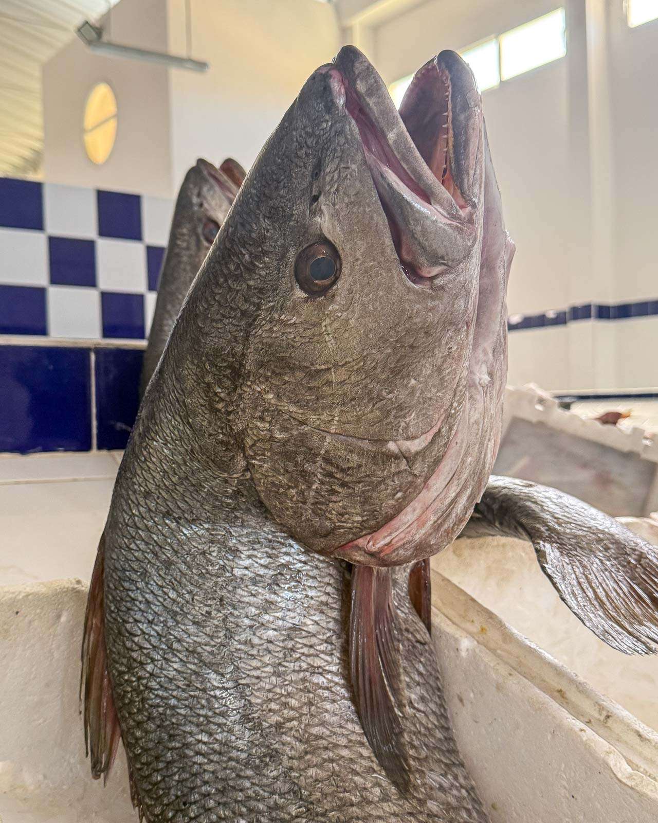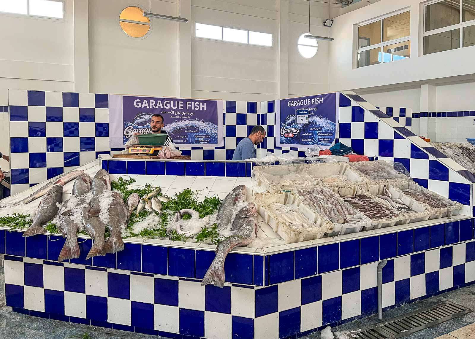 Ajattelin, että jos emme päässeet katsomaan kalastusaluksia, ehkä voisimme sentään nähdä kaloja. Mohammed teki saman tien U-käännöksen ja pian nousimme muutaman portaan suoraan keskelle kalamarkkinoiden vilinää.