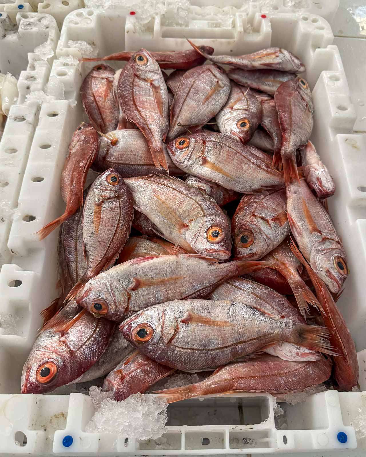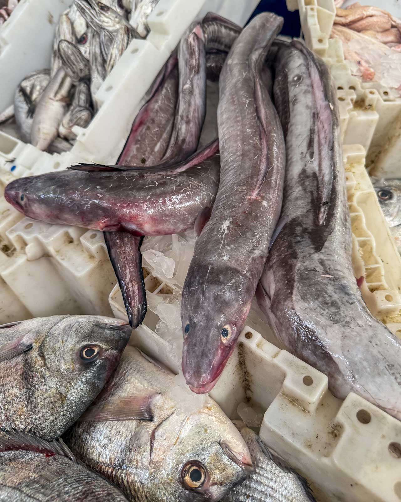 Markkinat olivat isot, tilat nykyaikaiset ja siistit ja myyjät ystävällisiä, jopa meille, vain valokuvia ottaville turisteille. Esillä oli monenlaisia kaloja, meille lähes kaikki ihan tuntemattomia kalalajeja, isoja ja pieniä, tummia ja punaisia. Mustekalojen myyjä vielä varmisteli, että tiedämmehän mitä nämä ovat ja nosti ne eteemme kuvattavaksi.