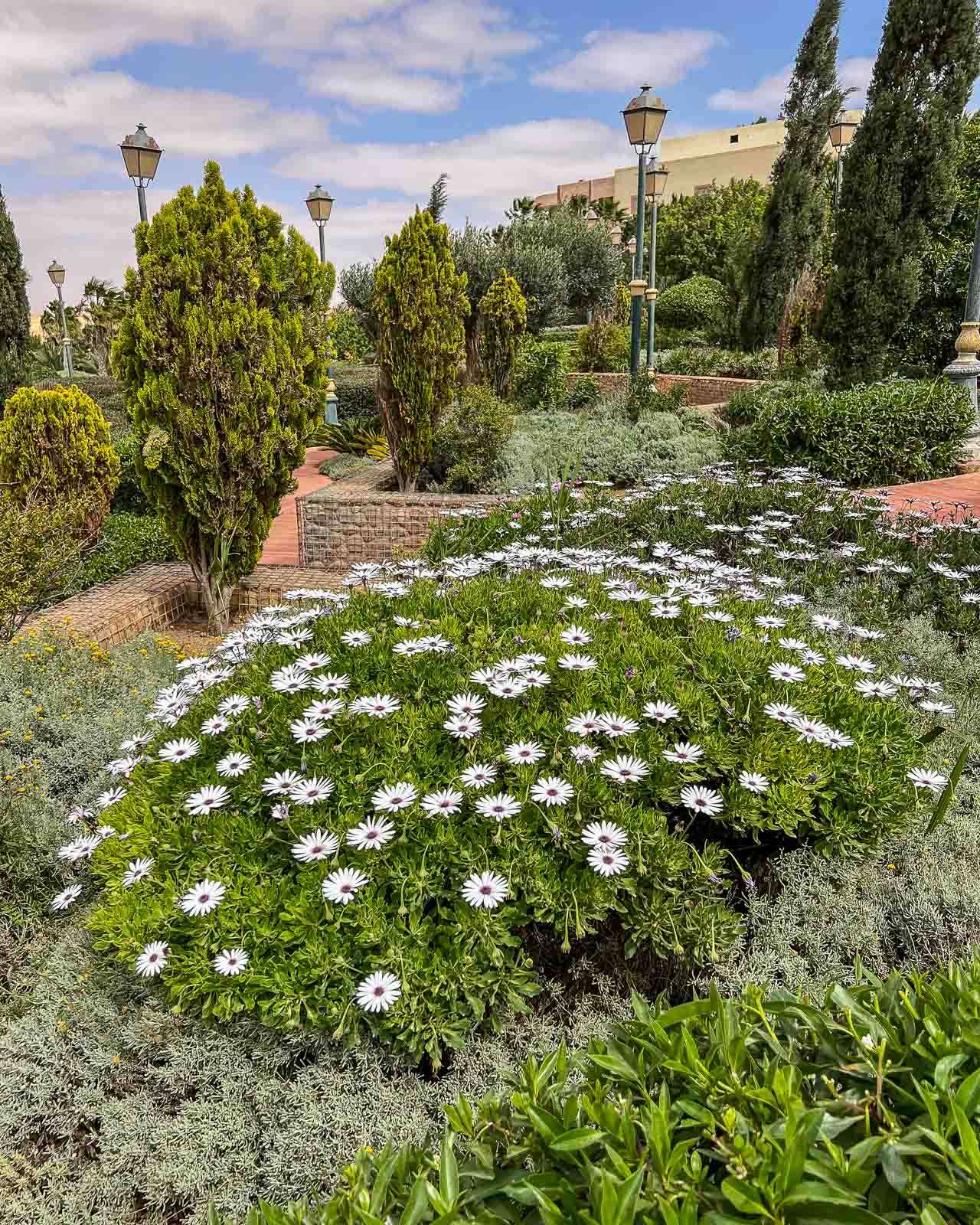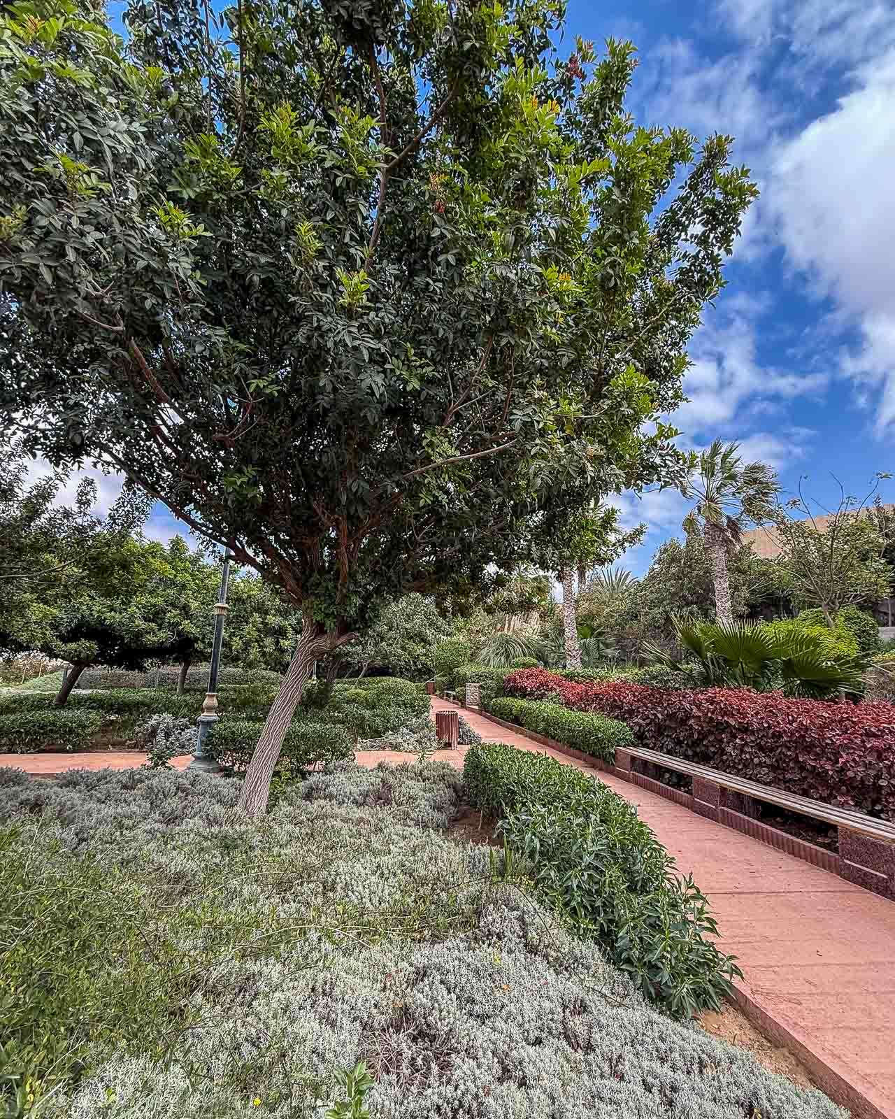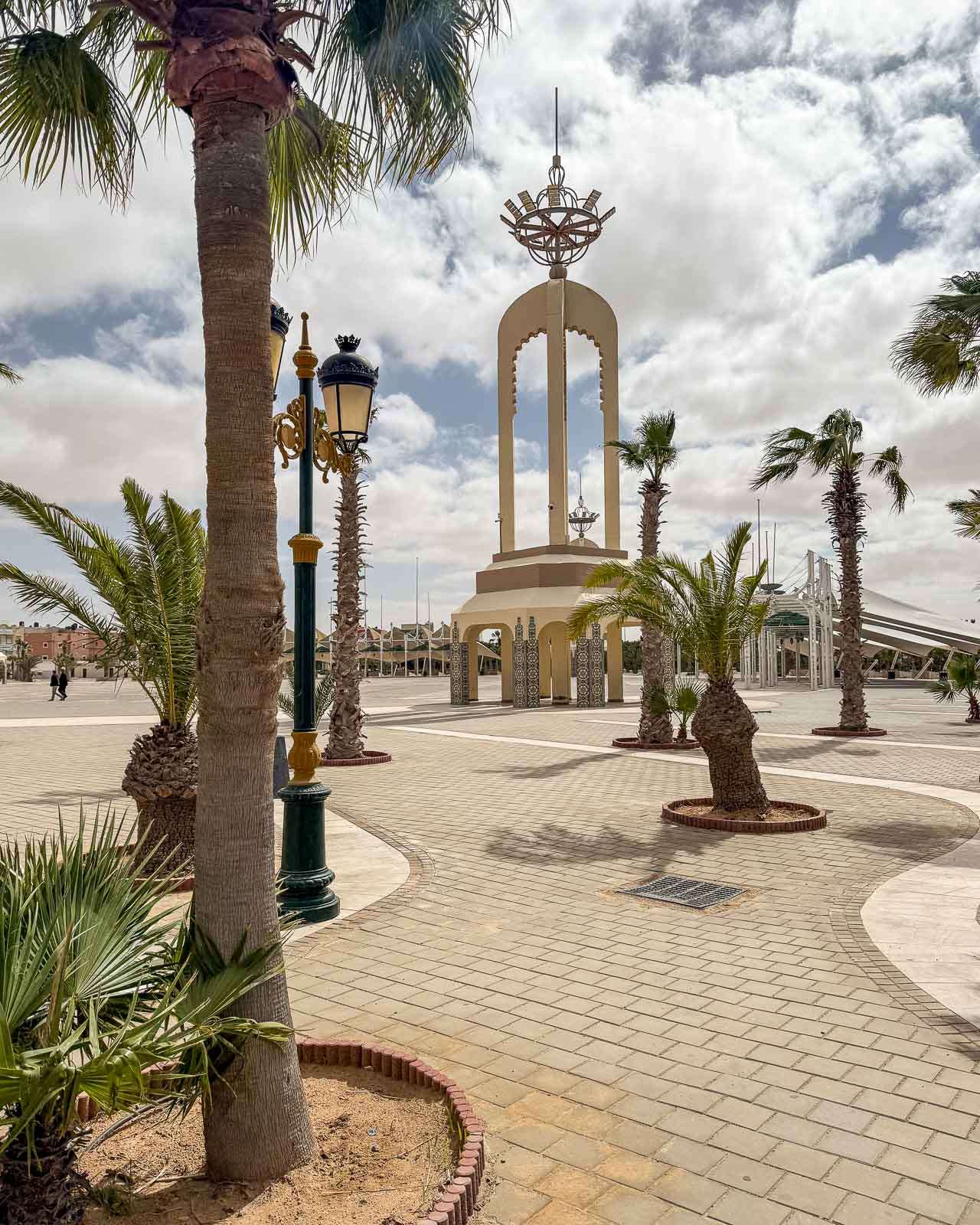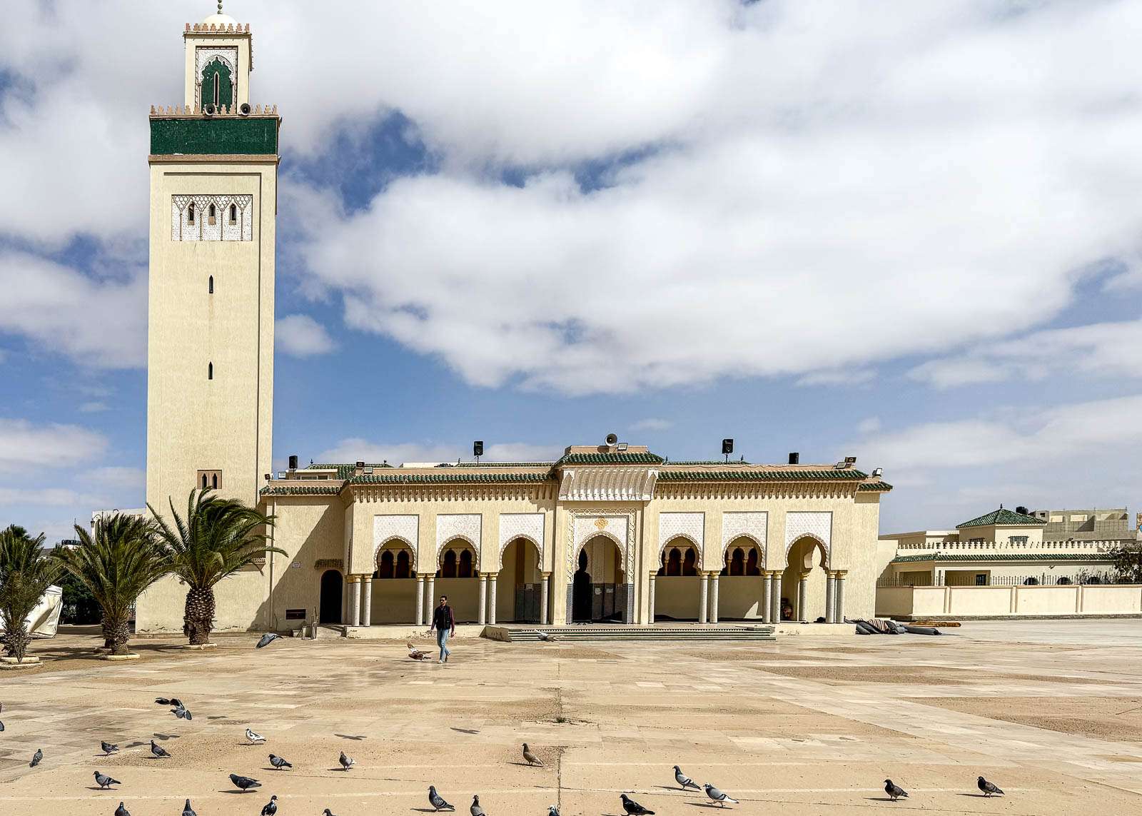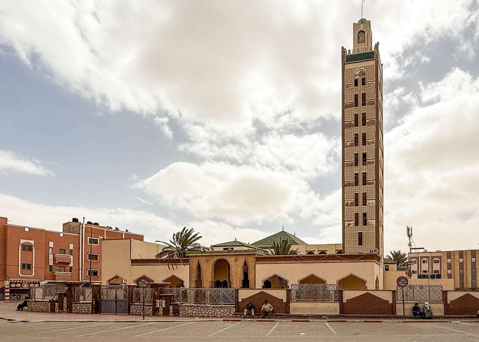 Ensimmäisen iltapäivän ensimmäinen retkemme suuntautui lintupuistoon, josta jo kirjoitinkin oman juttunsa. Samalla tuli nähtyä iso (ja ainakin päivällä autio) Place du Mechouar sekä sen vieressä oleva yllättävänkin vehreä puisto. Laayoune tuntui ensivaikutelmaltaan vähän ristiriitaiselta: hiekkaerämaan keskellä sijaitseva kaupunki, joka on hyvinkin vihreä. Läheisen moskeijan näimme vaan ulkoa – täällä ei ei-muslimeilla, ei miehilläkään, ole asiaa moskeijaan, ramadanina ainakaan.
