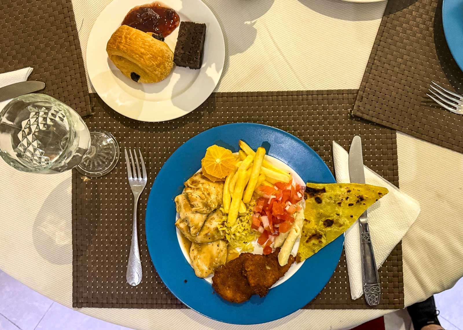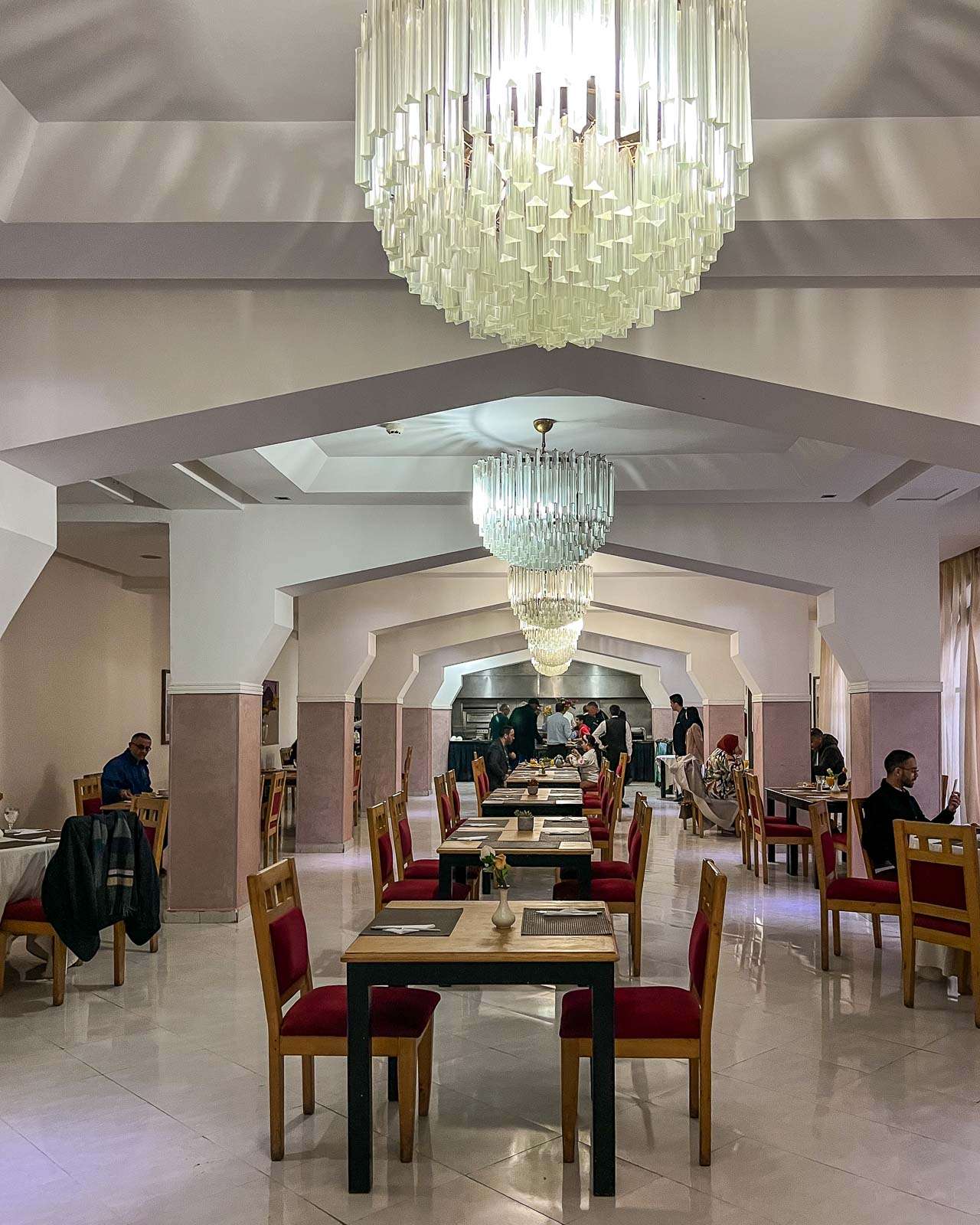 Toisen illallisen söimme hotellilla, joka tarjosi joka ilta paaston päättävän aterian, iftarin. Paikalle näytti tulevan paljon myös paikallisia, ja rytmi oli selvä: kun saavuimme noin kymmenen minuuttia tarjoilun alkamisen jälkeen, suurin osa ruoasta oli jo viety. Päivän paasto oli tehnyt tehtävänsä – nälkä ei jäänyt kenellekään epäselväksi.