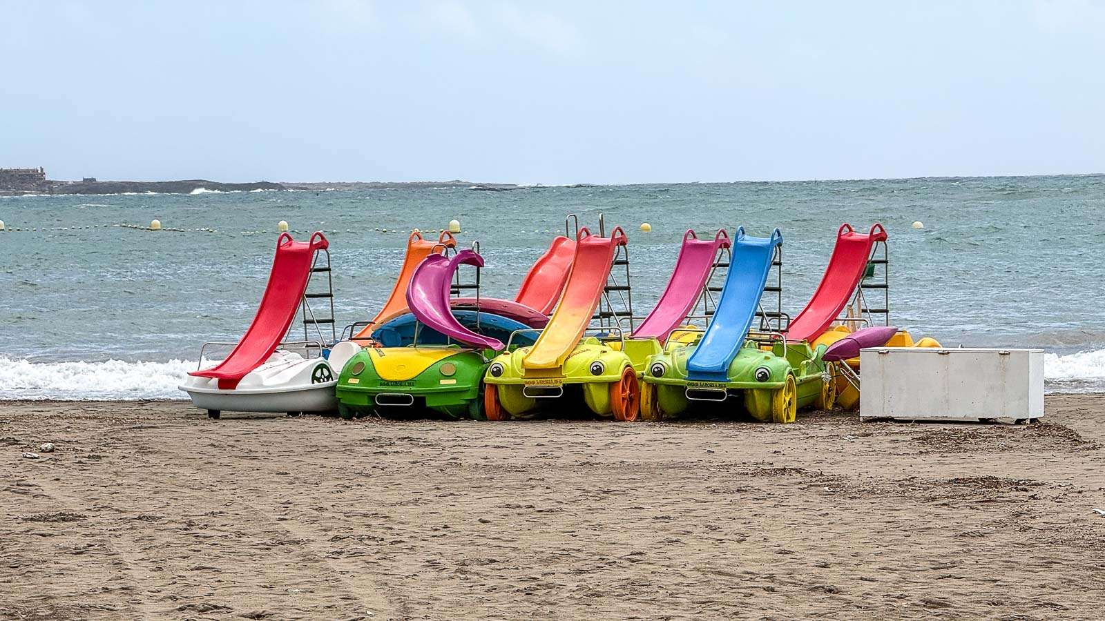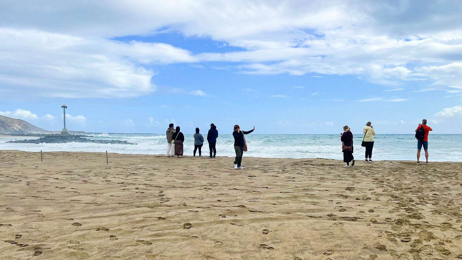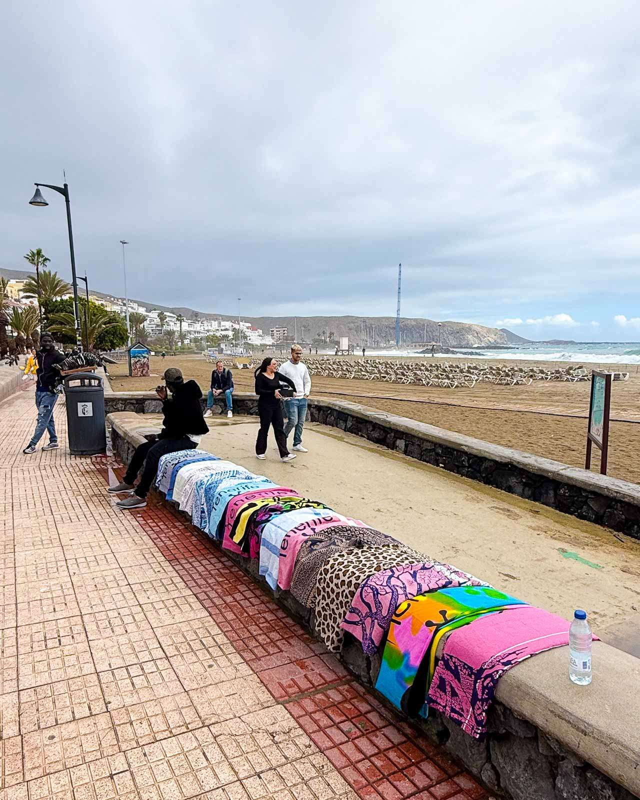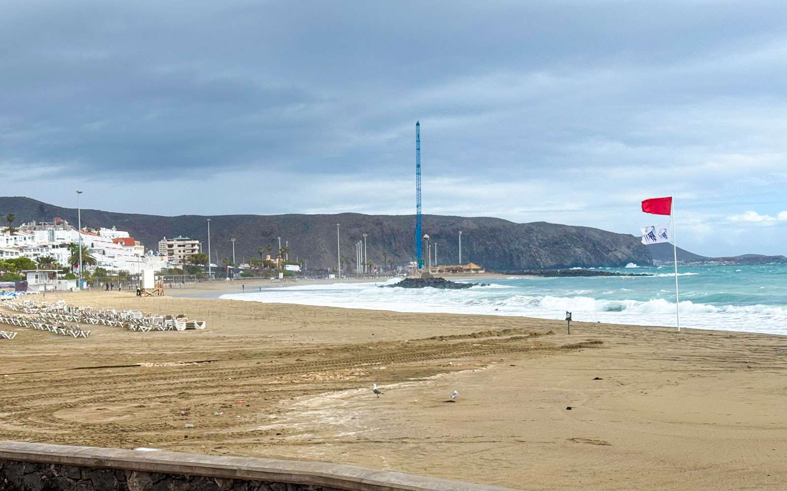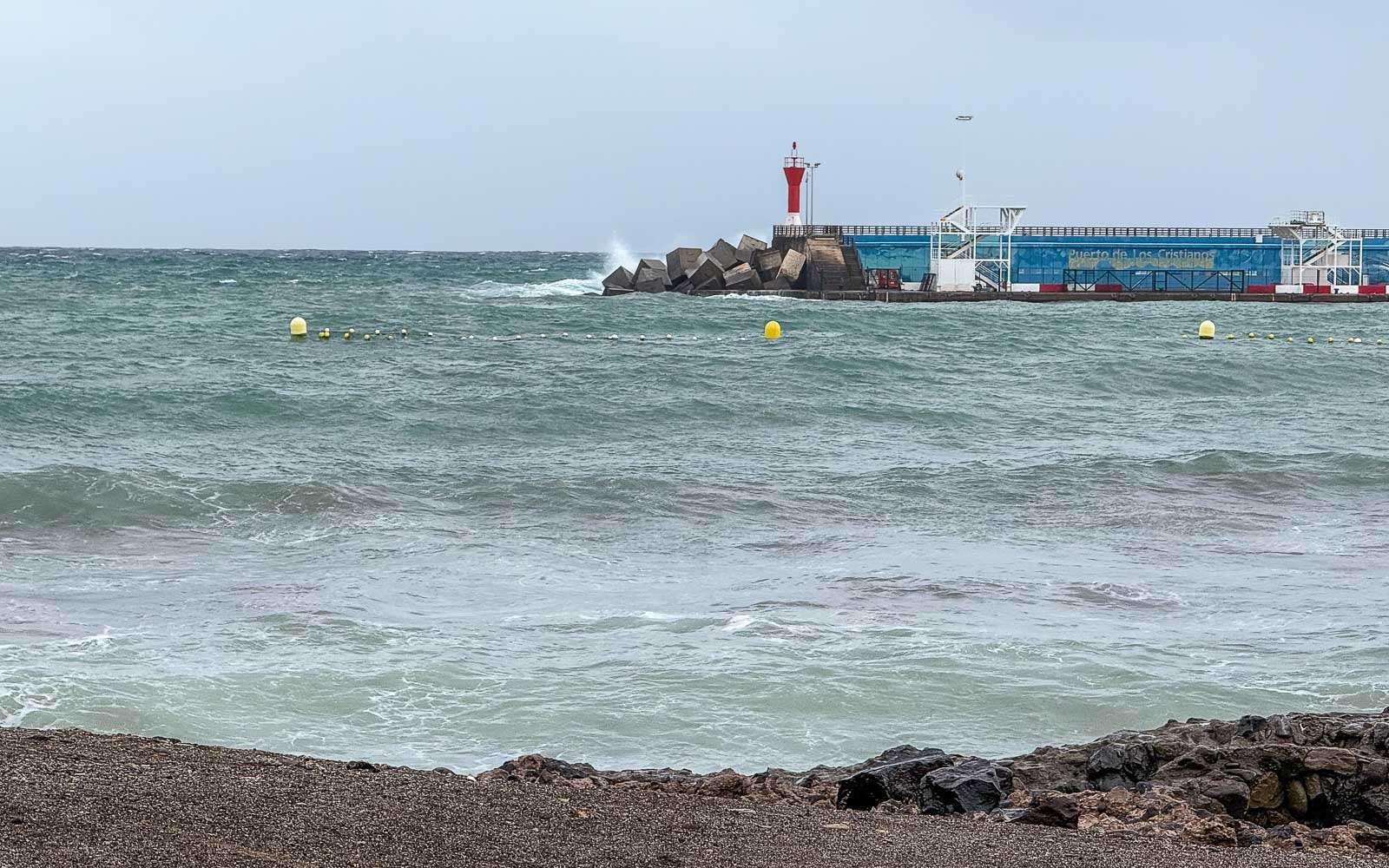 Myrskyävä meri oli kyllä näkemisen arvoinen. Punainen lippu, joka kielsi menemästä veteen, oli tangossa koko vierailumme ajan. Katsastimme parilla kävelyretkellä kaikki Los Cristianoksen rannat, ensin Playa de las Vistasin, sitten Playa de Los Cristianoksen ja lopuksi vielä pienemmän Playa De Los Tarajalesin. Itse rannat olivat muutamia valokuvaajia lukuunottamatta autioita, mutta rantabulevardilla riitti kävelijöitä – jotainhan ihmisten myrskypäivinäkin piti tehdä.