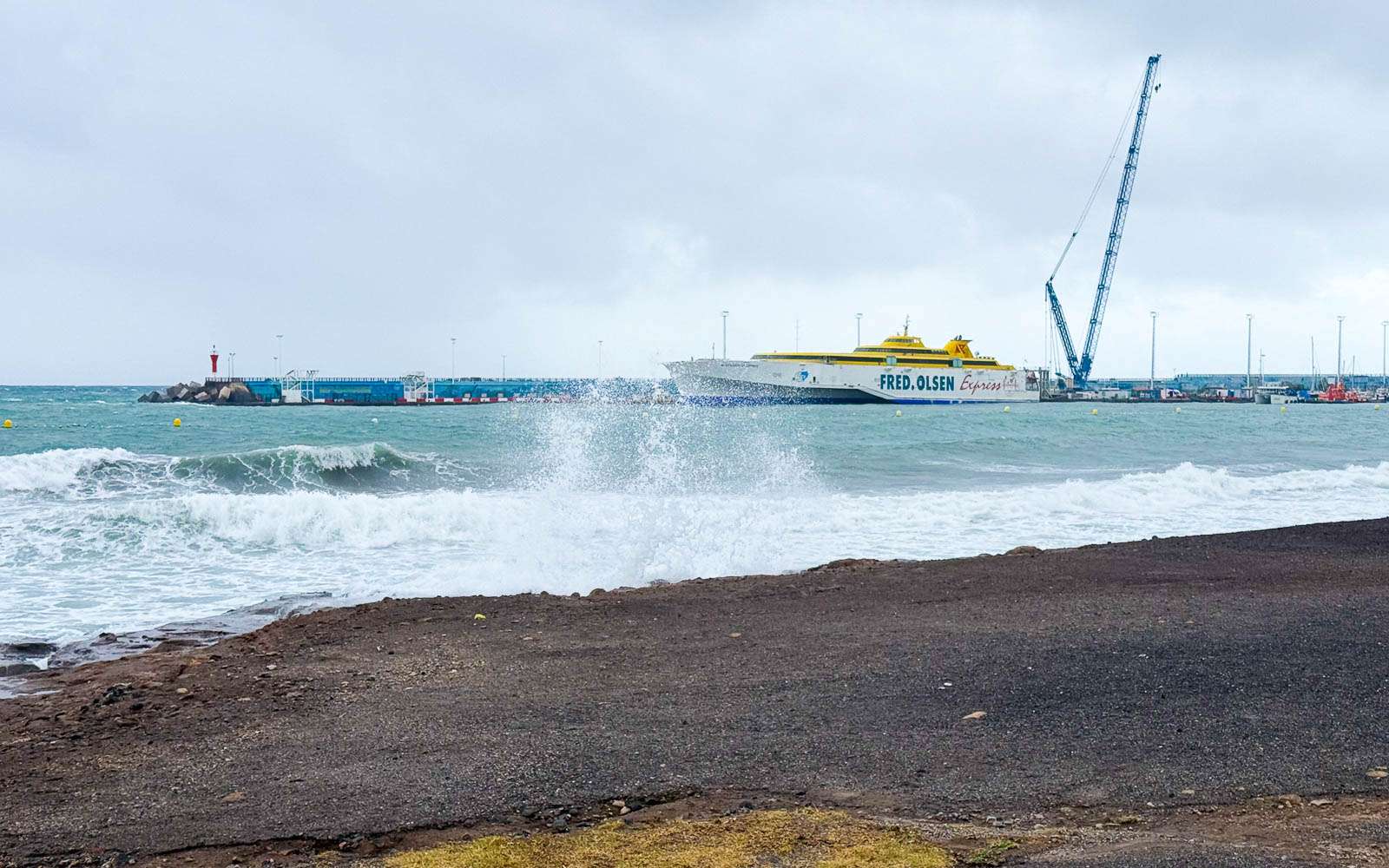 Rantaravintolassa seurasimme iltapäivällä meriliikennettä satamaan ja satamasta. Fred Olsenin ja Naviera Armaksen suuret lautat keinuivat rajusti myrskyssä. Myrsky teki myös ohjailusta haasteellista: välillä isotkin alukset näyttivät kääntyessään aaltoja vasten yllättävän vinoilta, ja moottoritkin tuntuivat olevan kovilla.