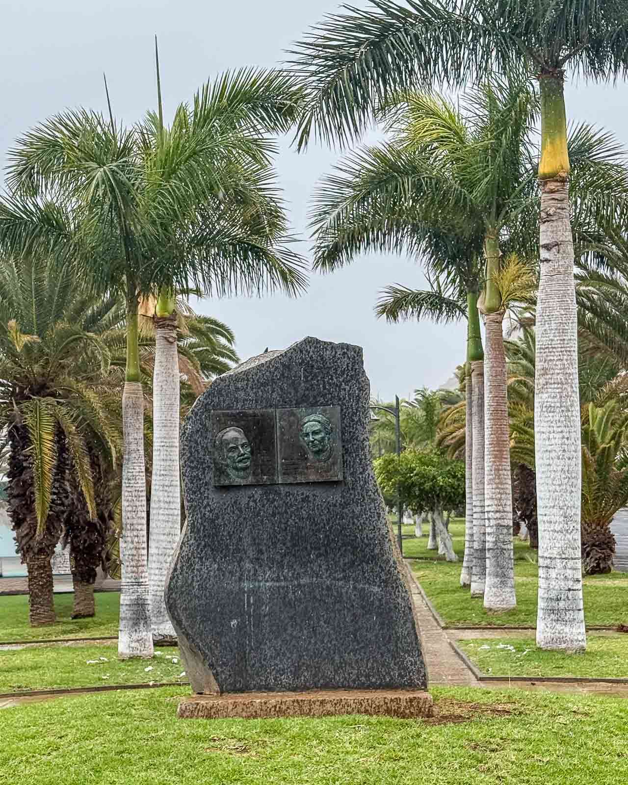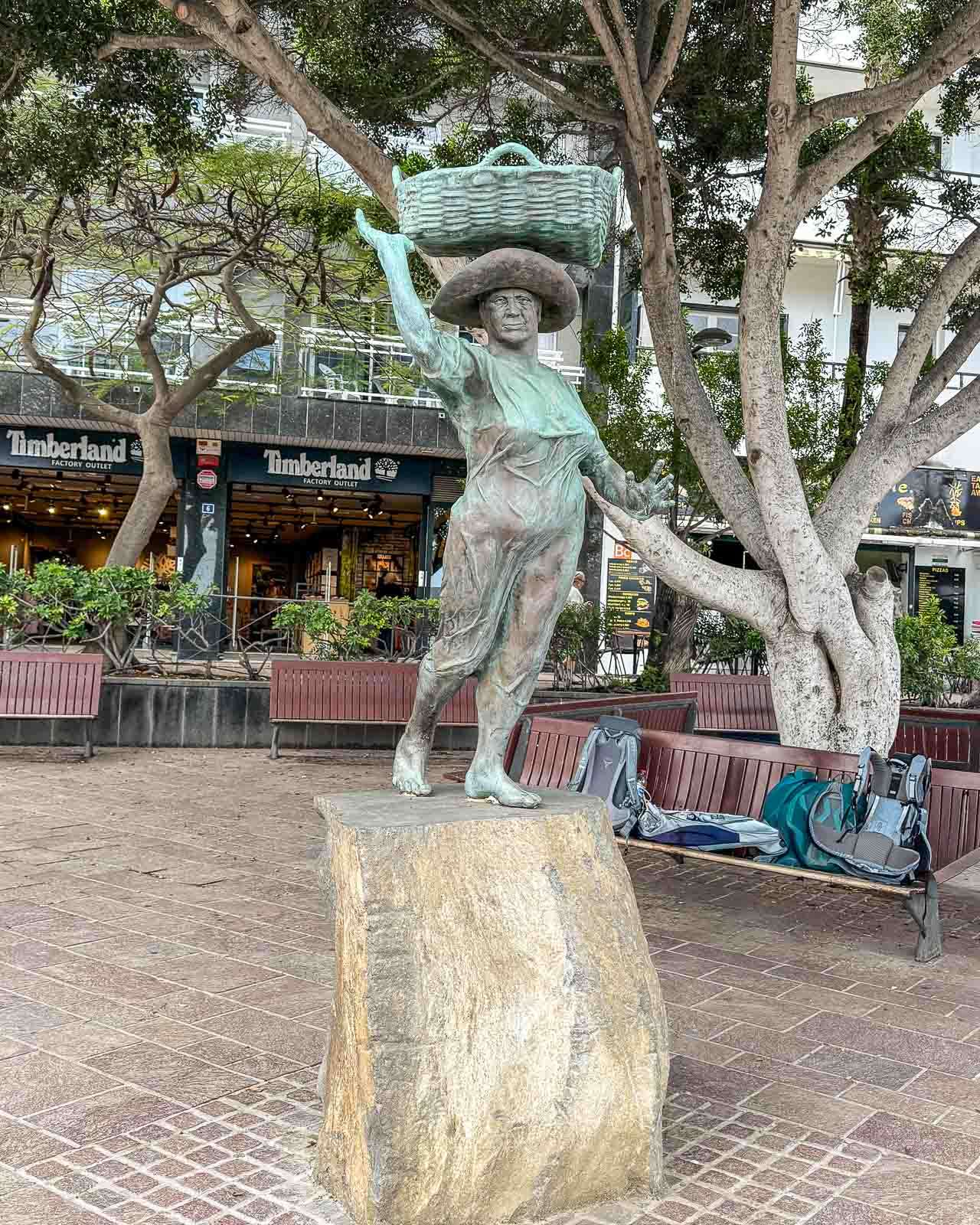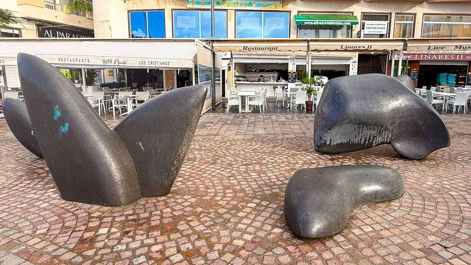Rannan tuntumassa oli myös hiukan kai Los Cristianoksen vanhaa kaupunkia kuten Plaza Pedro García Cabrera. Senkin suihkuallas oli tyhjänä, ehkä myrskyn takia tyhjennetty tai sitten paikka oli vaan jo nähnyt parhaat päivänsä. Muutaman patsaankin kävimme katsastamassa. Täältäkin löytyi kalastajavaimo siinä missä Puerto de la Cruzistakin. Palasiksi hajoitettu valas tuntui olevan lasten suosiossa rantabulevardilla.